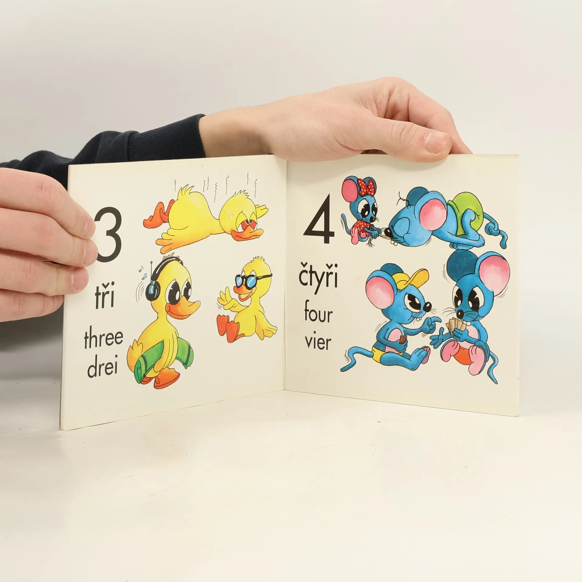 leporelo - na každé stránce číslovka ve třech jazycích s barevnými obrázky