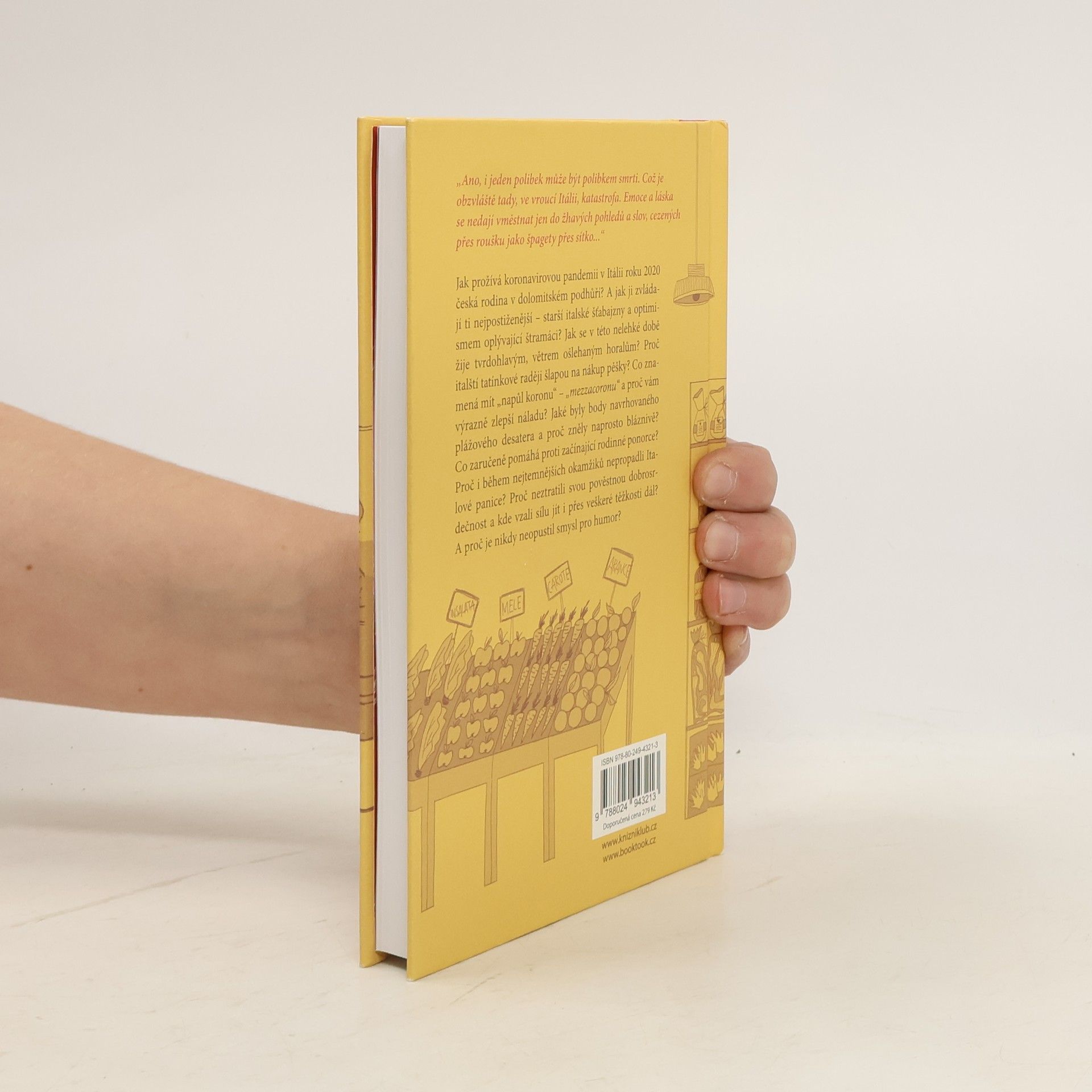 „Ano, i jeden polibek může být polibkem smrti. Což je obzvláště tady, ve vroucí Itálii, katastrofa. Emoce a láska se nedají vměstnat jen do žhavých pohledů a slov, cezených přes roušku jako špagety přes sítko...“ Jak prožívá těžkou koronavirovou pandemii v Itálii roku 2020 česká rodina v dolomitském podhůří? Jak se v této nelehké době žije tvrdohlavým, větrem ošlehaným horalům? Proč italští tatínkové nejezdí nakupovat autem, ale raději šlapou pěšky? Co znamená mít „napůl koronu“ – „mezzacoronu“ a proč vám výrazně zlepší náladu? Jaké byly body navrhovaného plážového desatera a proč zněly naprosto bláznivě? Co zaručeně pomáhá proti začínající rodinné ponorce? Proč má holka z hor častokrát větší přehled než kdejaký chytrolín z města? I přes velké psychické a fyzické vypětí autorka zapisovala a popisovala každodenně po nejkritičtější dva měsíce den pod dni. Věrně, bez příkras, samozřejmě s jemným humorem a všeobjímající italsko-českou laskavostí. Její postřehy a zážitky jsou psány zejména z prostředí za pultem podhorského krámku, který se stal po dobu několikaměsíčního zákazu vycházení, mimo lékáren a nemocnice, jediným centrem dění.