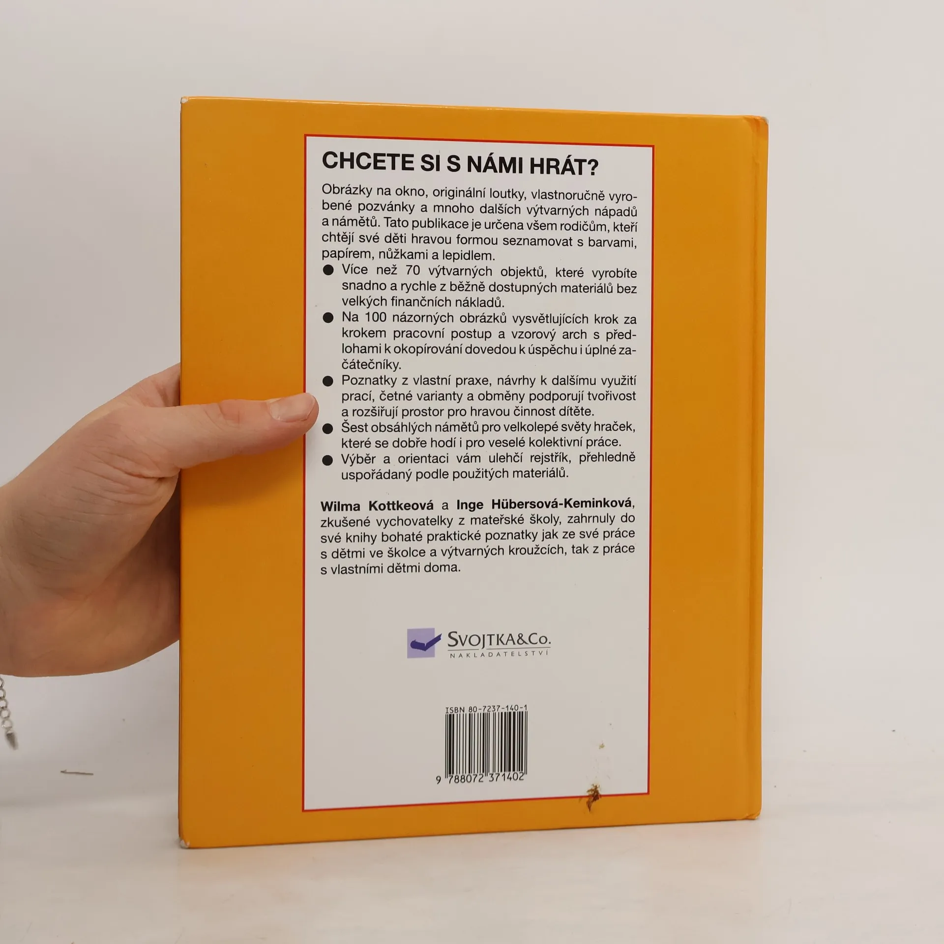 dalších výtvarných nápadů a námětů. Tato publikace'je určena všem rodičům, kteří chtějí své děti hravou formou seznamovat s barvami, papírem, nůžkami a lepidlem. . Více než 70 výtvarných objektů, které vyrobíte snadno a rychle z běžně dostupných materiálů bez velkých finančních nákladů. . Na 100 názorných obrázků vysvětlujících krok za krokem pracovní postup a vzorový arch s předlohami k okopírování dovedou k úspěchu i úplné začátečníky. . Poznatky z vlastní praxe, návrhy k dalšímu využití prací, četné varianty a obměny podporují tvořivost a rozšiřují prostor pro hravou činnost dítěte. . Šest obsáhlých námětů pro velkolepé světy hraček, které se dobře hodí i pro veselé kolektivní práce. . Výběr a orientaci vám ulehčí rejstřík, přehledně uspořádaný podle použitých materiálů.