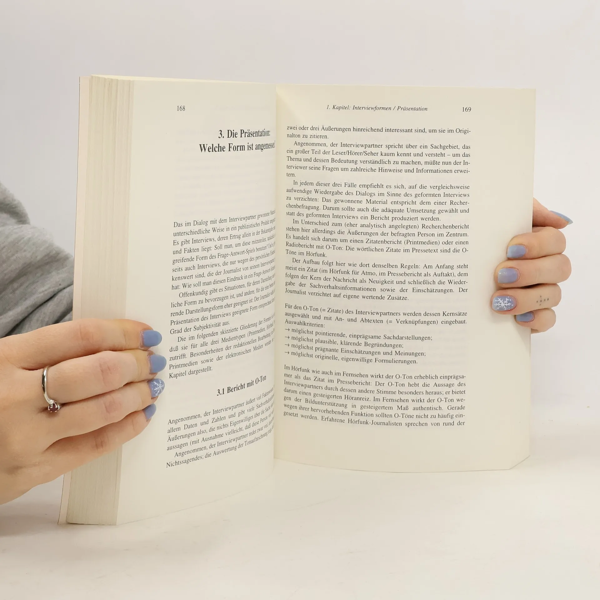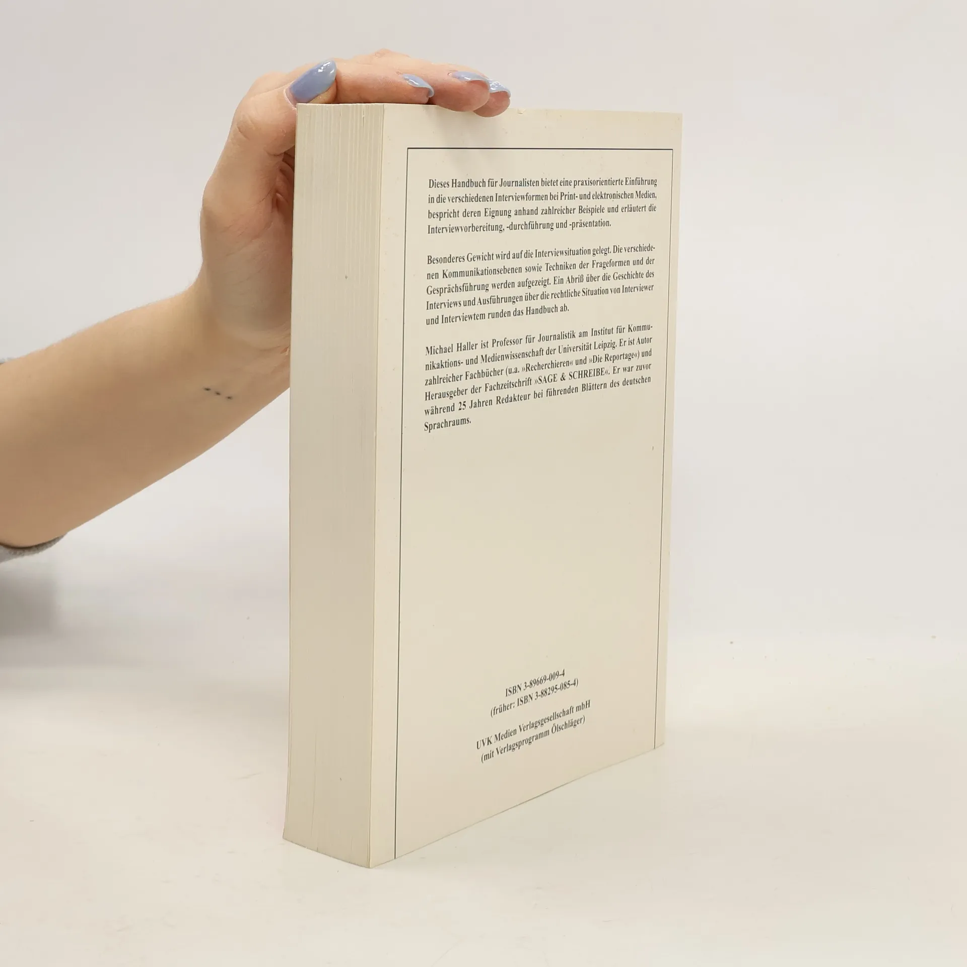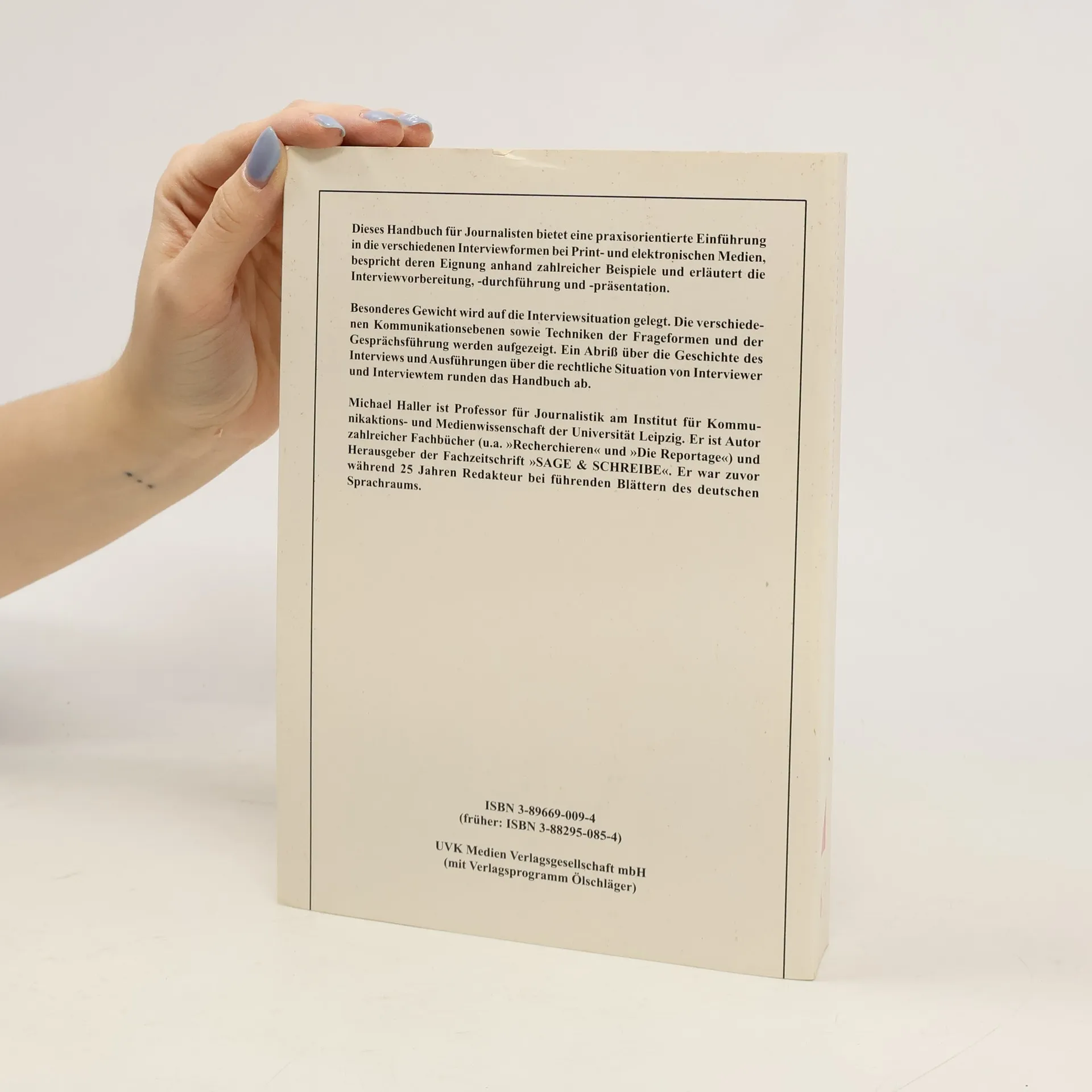 Dieses Handbuch für Journalisten bietet eine praxisorientierte Einführung in die verschiedenen Interviewformen bei Print- und elektronischen Medien, bespricht deren Eignung anhand zahlreicher Beispiele und erläutert die Interviewvorbereitung, -durchführung und -präsentation. Besonderes Gewicht wird auf die Interviewsituation gelegt. Die verschiedenen Kommunikationsebenen sowie Techniken der Frageformen und der Gesprächsführung werden aufgezeigt. Ein Abriss über die Geschichte des Interviews und Ausführungen über die rechtliche Situation von Interviewer und Interviewtem runden das Handbuch ab.