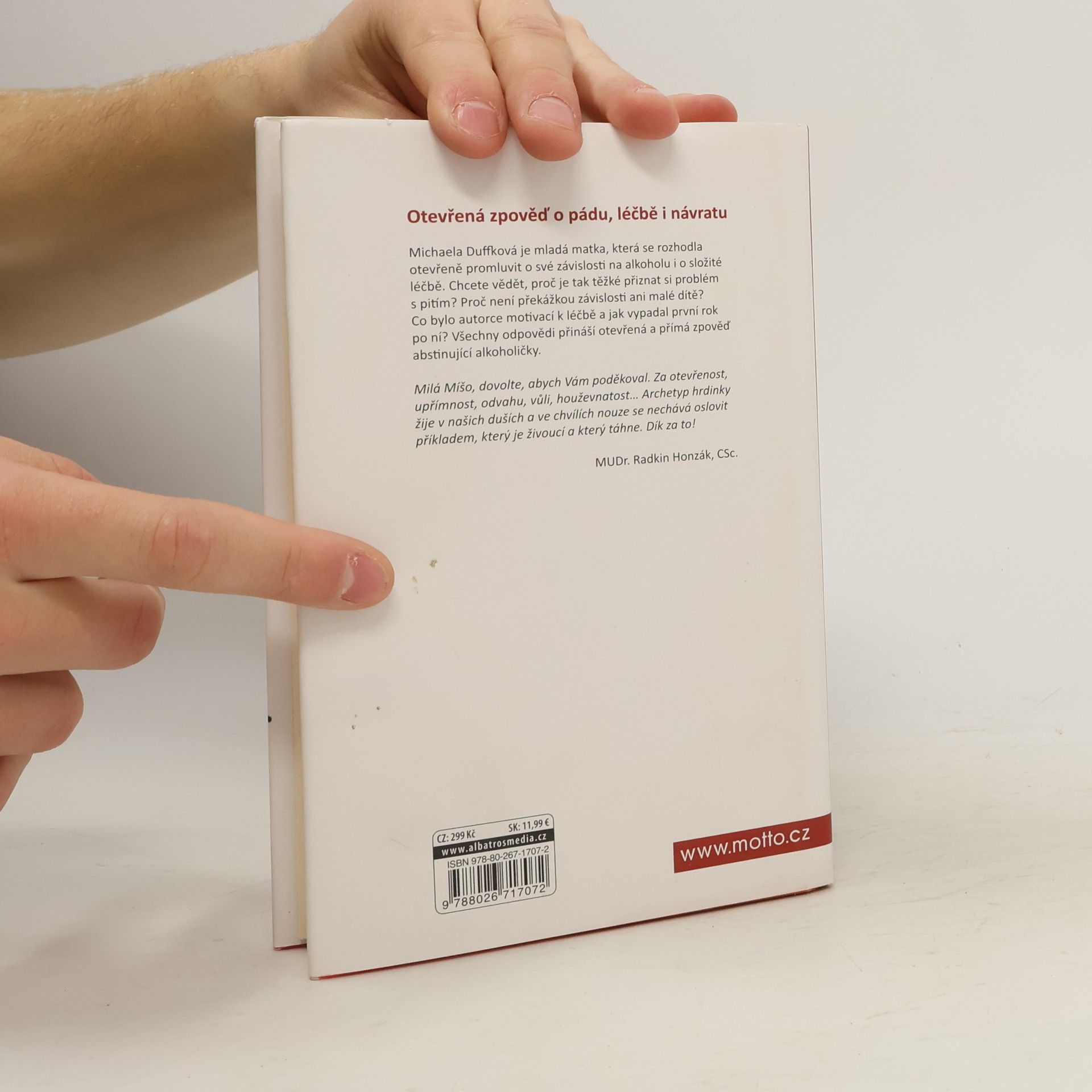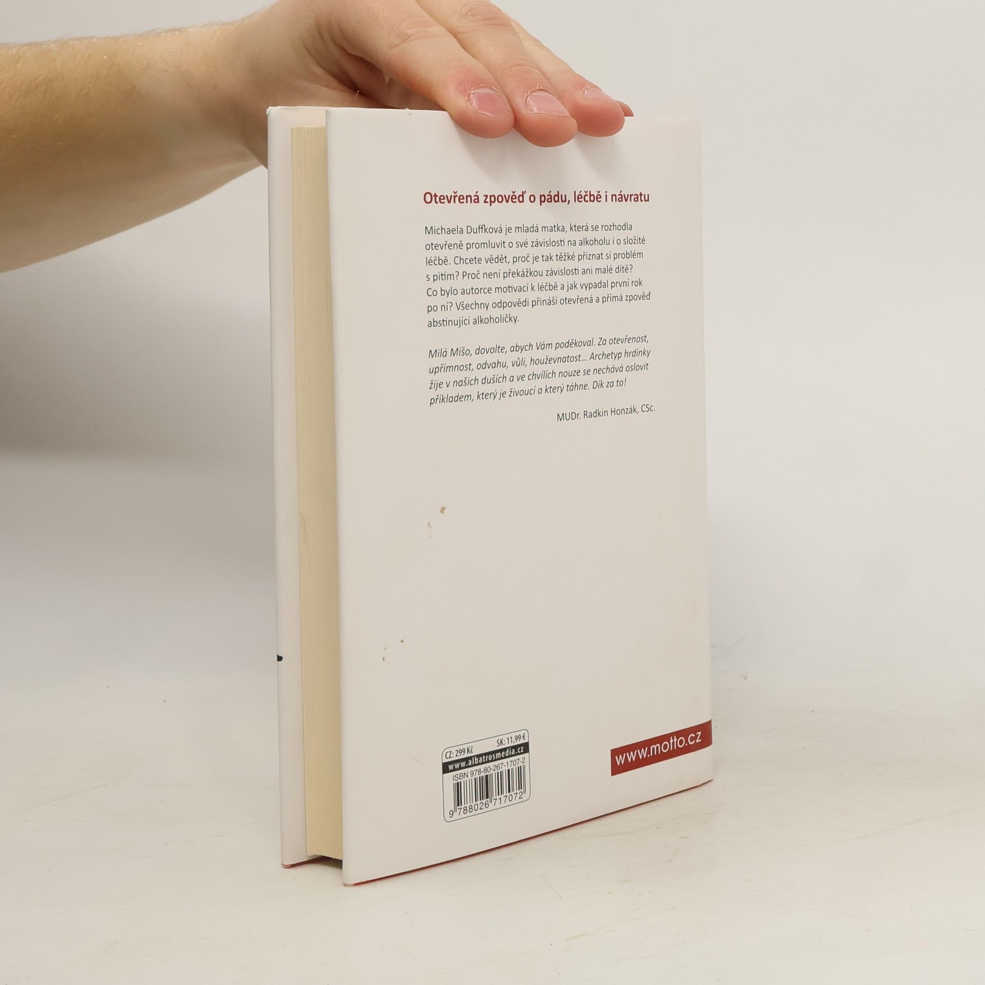 Poslední sklenička… dnes už popáté. Kniha podle blogu, který získal cenu Magnesia Litera. Michaela Duffková je mladá matka, která se rozhodla otevřeně promluvit o své závislosti na alkoholu i o složité léčbě. Chcete vědět, proč je tak těžké přiznat si problém s pitím? Proč není překážkou závislosti ani malé dítě? Co bylo autorce motivací k léčbě a jak vypadal první rok po ní? Všechny odpovědi přináší otevřená a přímá zpověď abstinující alkoholičky. Upřímně sdílená zkušenost o pádu doslova na dno vzbudila velký zájem veřejnosti, Michaela získala za svůj blog cenu Magnesia Litera a začala o závislosti veřejně přednášet. Dnes se věnuje svému vysněnému projektu – centru pro prevenci a léčbu závislosti na alkoholu. „Příběh Míši Duffkové je skvělým příspěvkem k destigmatizaci ženského alkoholismu a současně unikátní výpovědí o bolesti i naději.“ prof. PhDr. Michal Miovský, Ph.D. přednosta Kliniky adiktologie 1. LF UK a VFN