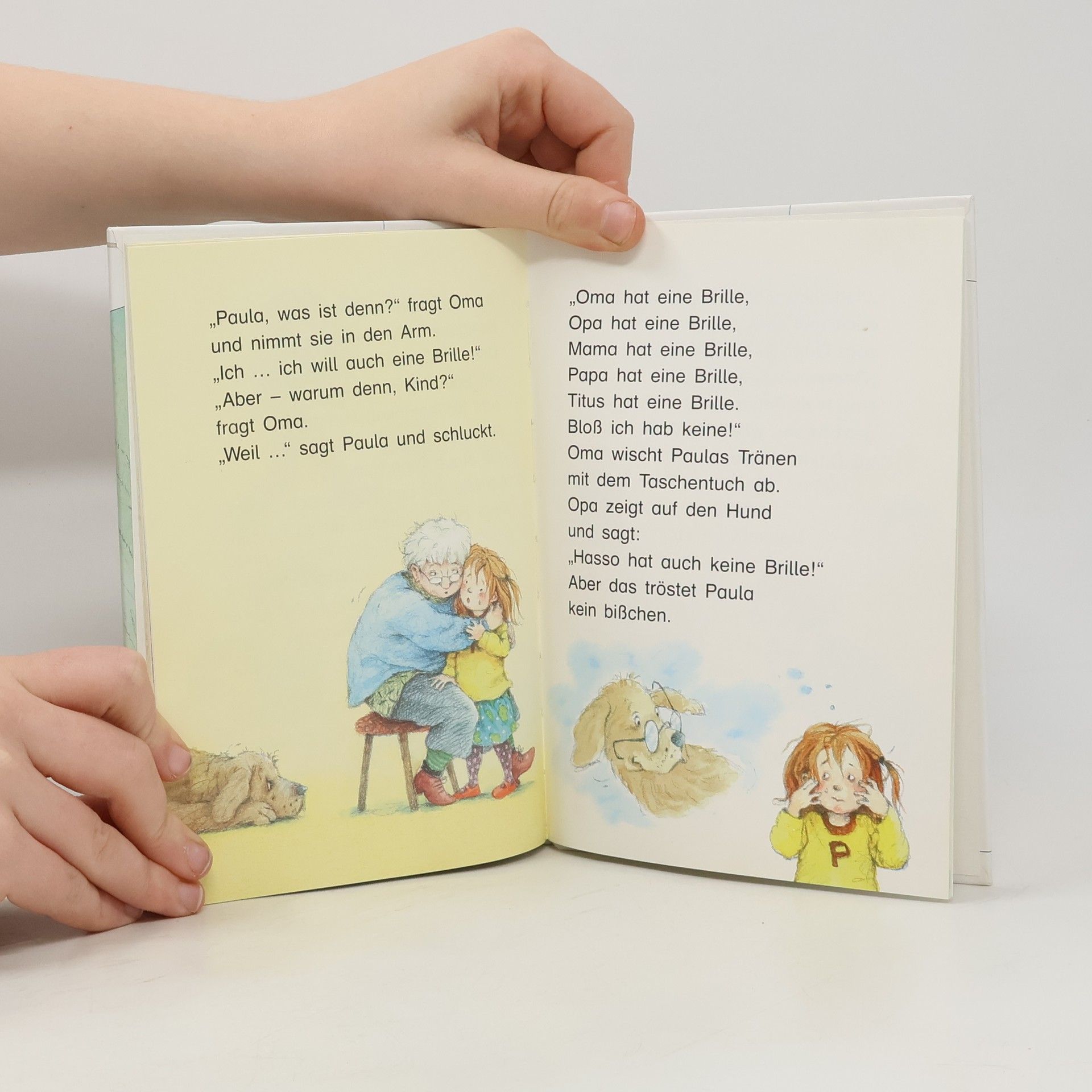 Paulas großer Bruder Titus bekommt eine Brille. Paula findet alles aufregend: den Besuch beim Augenarzt, den tollen Brillenladen und die Brille, die Titus sich aussucht. Deshalb steht für sie fest: Sie will auch eine Brille haben …