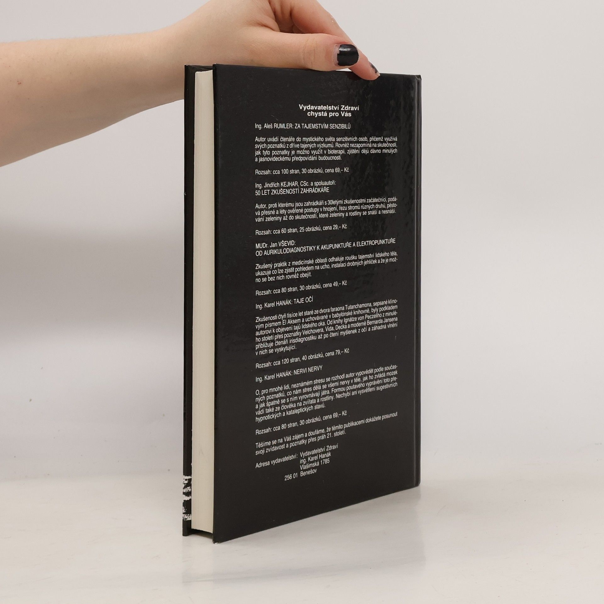 Autor nás ve své knize zasvětí do tajemství a technik okultismu- 1. vydání MYSTIKA NEBO REALITA? -Cesty poznání -Detektivka psychiky -Psychická sonda -Matička Země-maskovaná milenka -Stará cikánka -Magie smyslu -Nervové vlnění -Houbový les -Mrknutí okultismu -Záhada dlouhověkosti -Trapič REDOX -Krása zdraví -Řeč Etéru -Zhoubné bujení? -Šťastní dyslektikové VŠEMOHOUCÍ VLNĚNÍ -Podstata života -Životní boj 1. Život? Elektromagnetické vlnění! 2. Roďte nerodičky! 3. Chudák vlnění 4. Budoucnost vlnění 5. Lidský generátor 6. Buněčné elektrárny 7. Tvarování zdraví 8. Technický nerv 9. Fuj, kancerogeny 10. Zajaté neurony 11. Samovražedný neuron 12. Hold vitamínům 13. Falešný nerv 14. STOP operacím 15. Výroba nemoci 16. Vybíravé nádory 17. Lidský vysílač 18. Senzibil budič 19. Uzdravování vlnou 20. Elektromagnetické pomůcky 21. Všemohoucí pole 22. Genetické vlny 23. Výměny duší 24. Dálkové diagnostikování 25. Pravotočivá vlna 26. Únava vlny 27. Metabolická vlna 28. Levotočiví pomocníci 29. Elektrolytický čardáš 30. Bezvlnná smrt 31. Všehoschopná vlna KAŽDÝ LÉČITELEM? -Léčitelský úvod -Vitaminová bouře -Životosprávný způsob -Živá voda -Dálkové ovlivňování -Taje očí -Cesta nesmrtelnosti