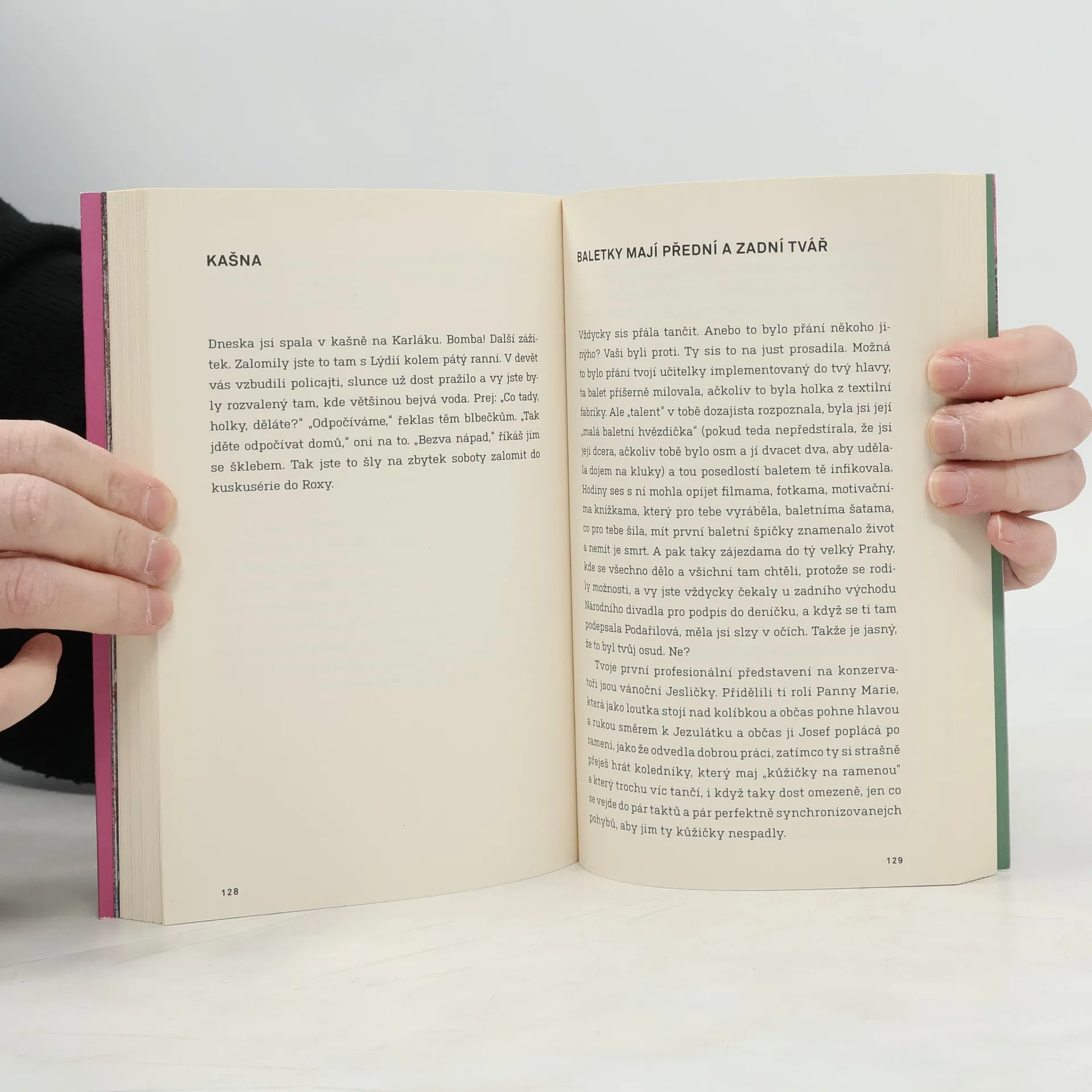 Baletky mají dvě tváře. Tu přední, usměvavou a dokonalou, kterou vidí publikum. A pak tu odvrácenou, když zmizí za oponou, předpisový úsměv jim spadne a tvář se zkřiví do ztrhaného šklebu, protože se dusí. Při tanci totiž nemůžou dýchat pusou. Třeští oči a lapají po dechu. Kdyby baletky někdo takhle nafilmoval, byla by to přehlídka utrpení. K tomu jsou ale trénované. Tak jako hlavní hrdinka tohohle příběhu. Každý den zažívá baletní dril jako v armádě. Ještě jí nebylo čtrnáct, a už je odbornicí na používání projímadel a zvracení, aby si udržela váhu, na ošetřování krvavých palců a stahování prsou. A do toho poznává klubový život v Praze. Jsou devadesátá léta, frčí perník a extáze a ona objevuje sex a zjišťuje, že má nevlastního bratra, který je úplně jiný, než by chtěla. A že její sen stát se baletkou a tančit ve Zlaté kapličce se mění v noční můru. Režisérka a tanečnice Miřenka Čechová vychází z vlastních zkušeností a deníkových zápisků. Její próza je sebeironickým, syrovým a nelítostným obrazem studií na Taneční konzervatoři a pražského života v divokých 90. letech.