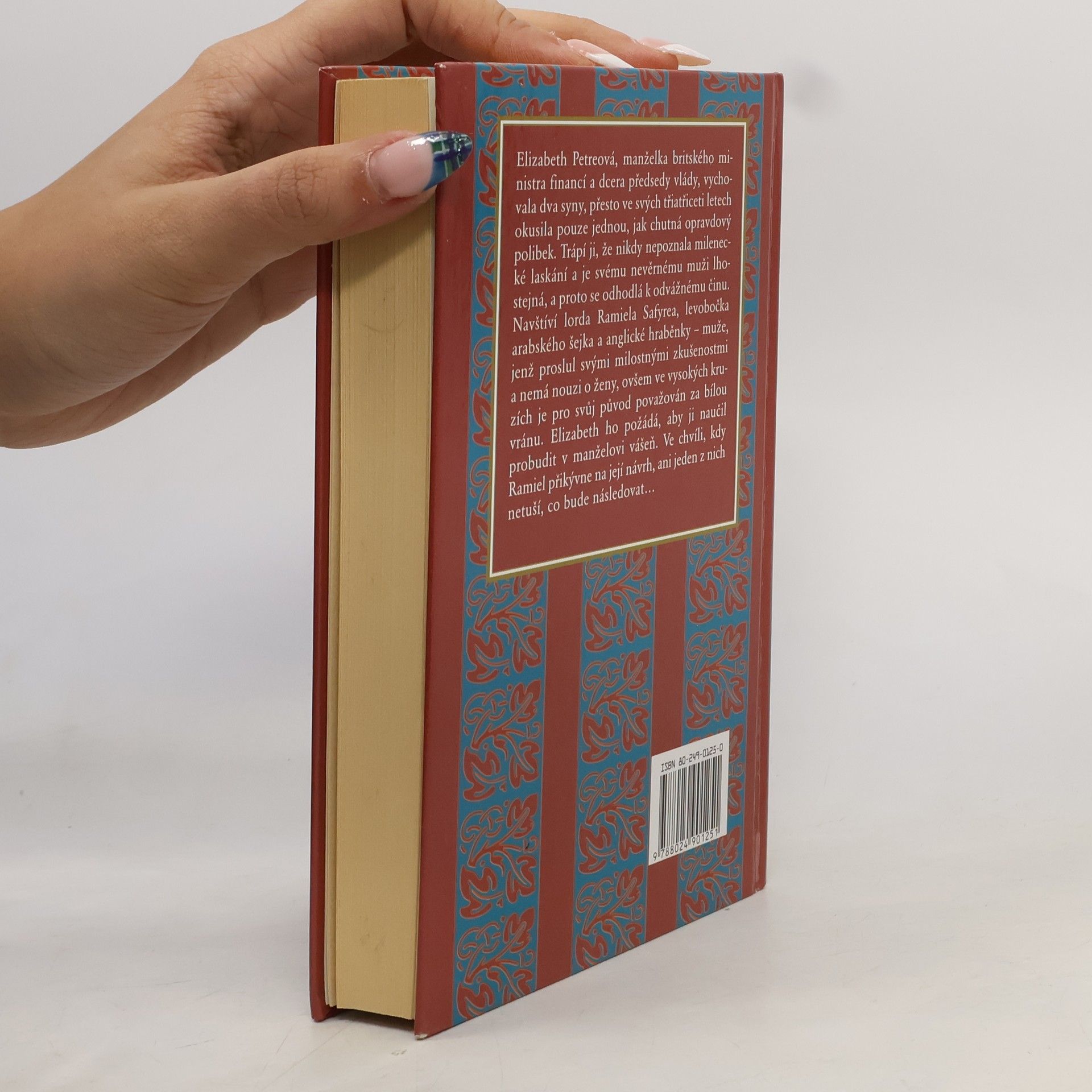 Román z viktoriánské Anglie o ženě, která chce vylepšit svůj manželský život a naučit se eroticky uspokojit manžela. Za tímto účelem osloví Elizabeth Petreová lorda Safyrea, který je levobočkem arabského šejka a anglické šlechtičny a je proslulý svými milostnými úspěchy. Pruderní výchova této doby, neumožnila této třicetileté ženě, matce dvou synů, téměř žádné sexuální zkušenosti. Cítí, že její manželský život je ohrožen a chce ve svém manželovi probudit vášeň. Manžel však na její pokusy nereaguje, zato vztah mezi Elizabeth a lordem Safyerem nabývá nečekaných rozměrů. Šokující je i odhalení manželových milostných vztahů.