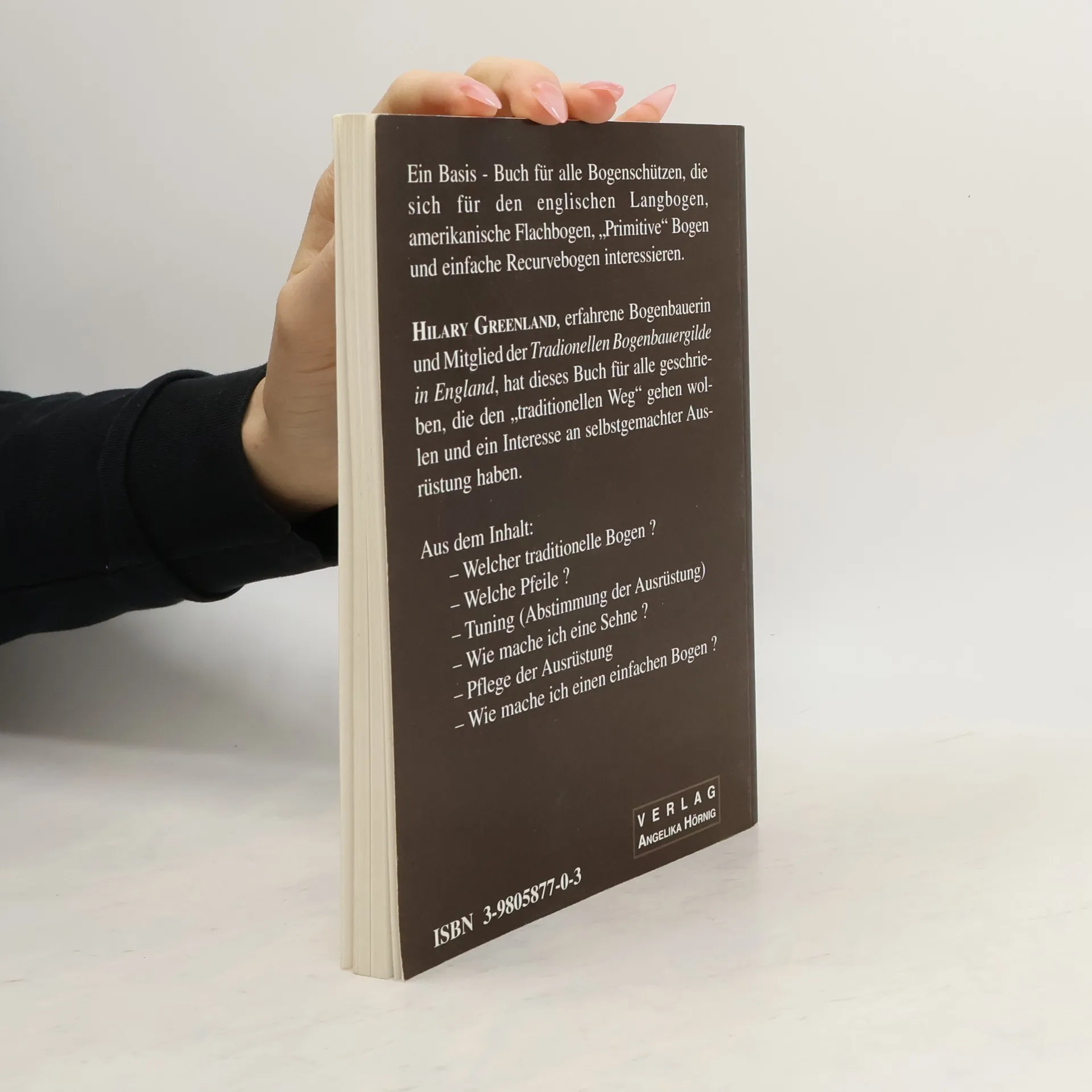 Ein Basis-Buch für alle Bogenschützen, die sich für den englischen Langbogen, amerikanische Flachbogen, "Primitive" Bogen und einfache Recurvebogen interessieren. Hilary Greenland, erfahrene Bogenbauerin und Mitglied der Traditionellen Bogenbauergilde in England, hat dieses Buch für alle geschrieben, die den "traditionellen Weg" gehen wollen und ein Interesse an selbstgemachter Ausrüstung haben. - Welcher traditionelle Bogen? - Welche Pfeile? - Tuning (Abstimmung der Ausrüstung) - Wie mache ich eine Sehne? - Pflege der Ausrüstung - Wie mache ich einen einfachen Bogen?