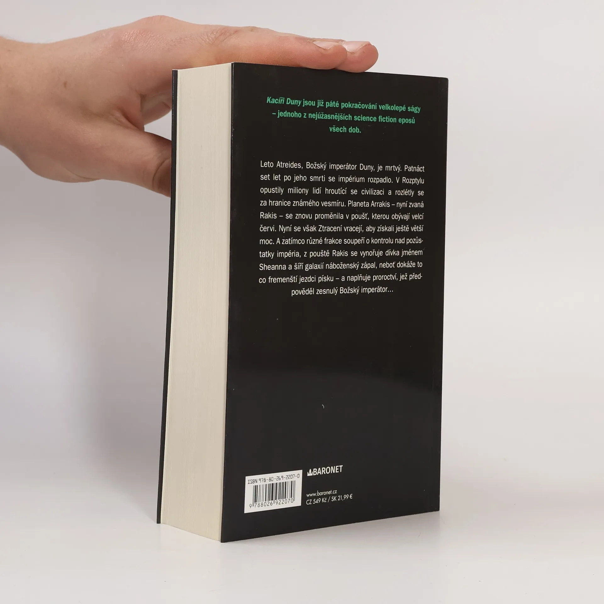 Kacíři Duny - retro vydání. Páté pokračování monumentální ságy! Leto Atreides je mrtvý. Patnáct set let po jeho smrti se impérium rozpadlo. Planeta Arrakis se znovu proměnila v poušť, kterou obývají pouze velcí červi. Nyní se však Ztracení vracejí, aby získali ještě větší moc. A zatímco různé frakce soupeří o kontrolu nad pozůstatky impéria, z pouště Rakis se vynořuje dívka jménem Sheanna a šíří galaxií náboženský zápal a naplňuje proroctví, jež předpověděl zesnulý Božský imperátor