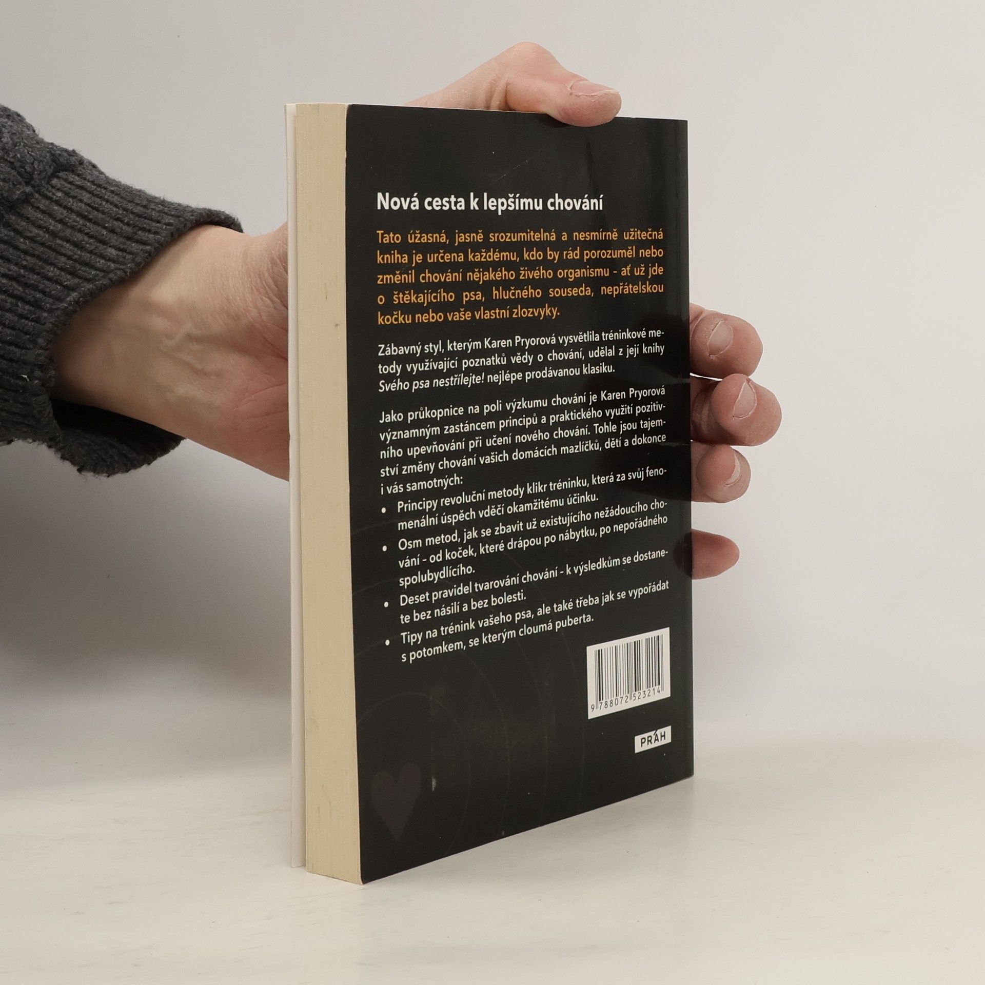 Zakladatelka klikr tréninku Karen Pryorová napsala knihu Svého psa nestřílejte!, která přináší zcela nový přístup k učení a trénování psa, ale nejen jeho. Tato úžasná, jasně srozumitelná a nesmírně užitečná kniha je určena každému, kdo by rád porozuměl nebo změnil chování nějakého živého organismu - ať už jde o štěkajícího psa, hlučného souseda, nepřátelskou kočku nebo vaše vlastní zlozvyky. Světově uznávaná klasika Jako průkopnice na poli výzkumu chování je Karen Pryorová významným zastáncem principů a praktického využití pozitivního upevňování při učení nového chování. Tohle jsou tajemství změny chování vašich domácích mazlíčků, dětí a dokonce i vás samotných: Principy revoluční metody klikr tréninku, která za svůj fenomenální úspěch vděčí okamžitému účinku. Osm metod, jak se zbavit už existujícího nežádoucího chování - od koček, které drápou po nábytku, po nepořádného spolubydlícího. Deset pravidel tvarování chování - k výsledkům se dostanete bez násilí a bez bolesti. Tipy na trénink vašeho psa, ale také třeba jak se vypořádat s potomkem, se kterým cloumá puberta.