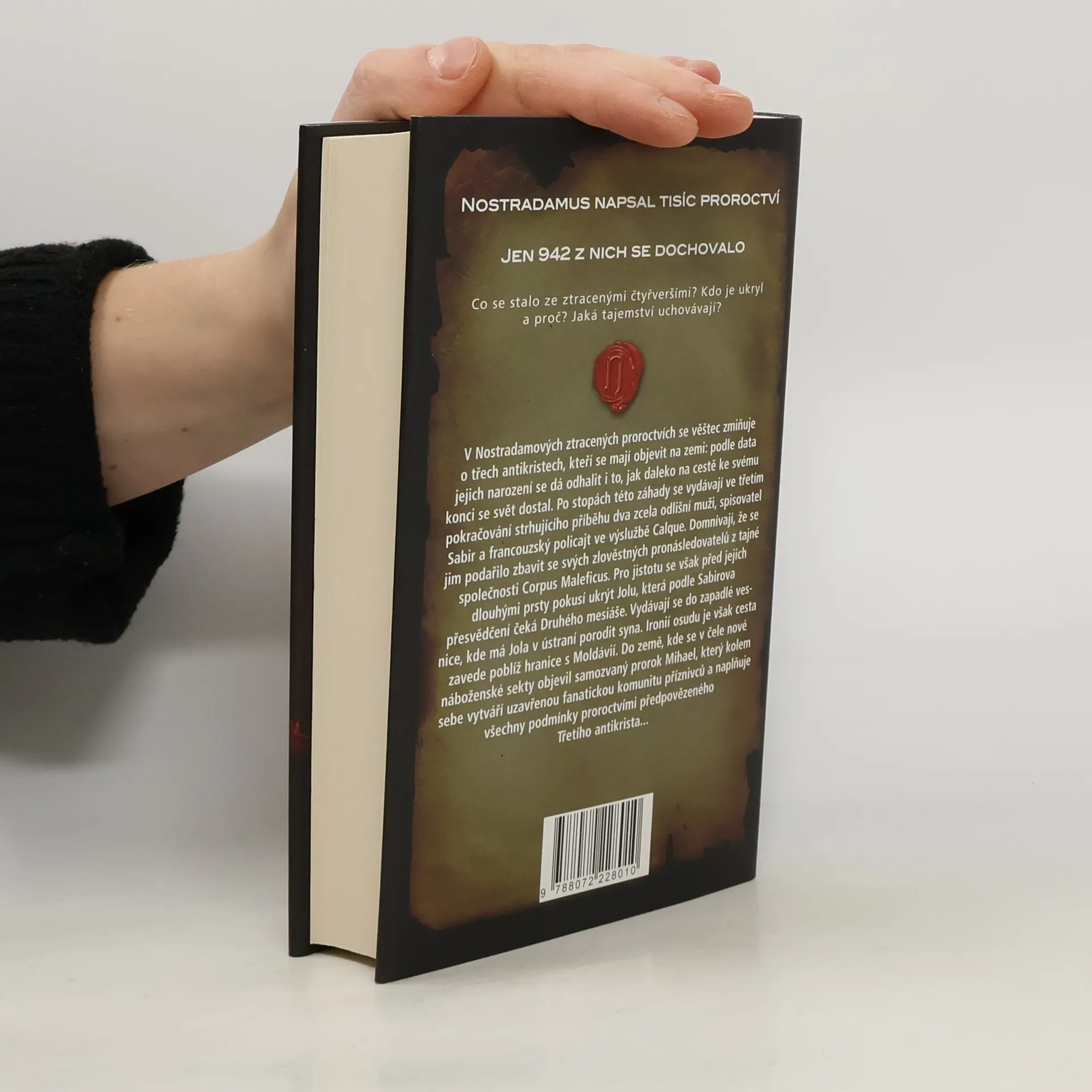 Nostradamus napsal tisíc proroctví Jen 942 z nich se dochovalo Co se stalo ze ztracenými čtyřveršími? Kdo je ukryl a proč? Jaká tajemství uchovávají? V Nostradamových ztracených proroctvích se věštec zmiňuje o třech antikristech, kteří se mají objevit na zemi: podle data jejich narození se dá odhalit i to, jak daleko na cestě ke svému konci se svět dostal. Po stopách této záhady se vydávají ve třetím pokračování strhujícího příběhu dva zcela odlišní muži, spisovatel Sabir a francouzský policajt ve výslužbě Calque. Domnívají, že se jim podařilo zbavit se svých zlověstných pronásledovatelů z tajné společnosti Corpus Maleficus. Pro jistotu se však před jejich dlouhými prsty pokusí ukrýt Jolu, která podle Sabirova přesvědčení čeká Druhého mesiáše. Vydávají se do zapadlé vesnice, kde má Jola v ústraní porodit syna. Ironií osudu je však cesta zavede poblíž hranice s Moldávií. Do země, kde se v čele nové náboženské sekty objevil samozvaný prorok Mihael, který kolem sebe vytváří uzavřenou fanatickou komunitu příznivců a naplňuje všechny podmínky proroctvími předpovězeného Třetího antikrista...