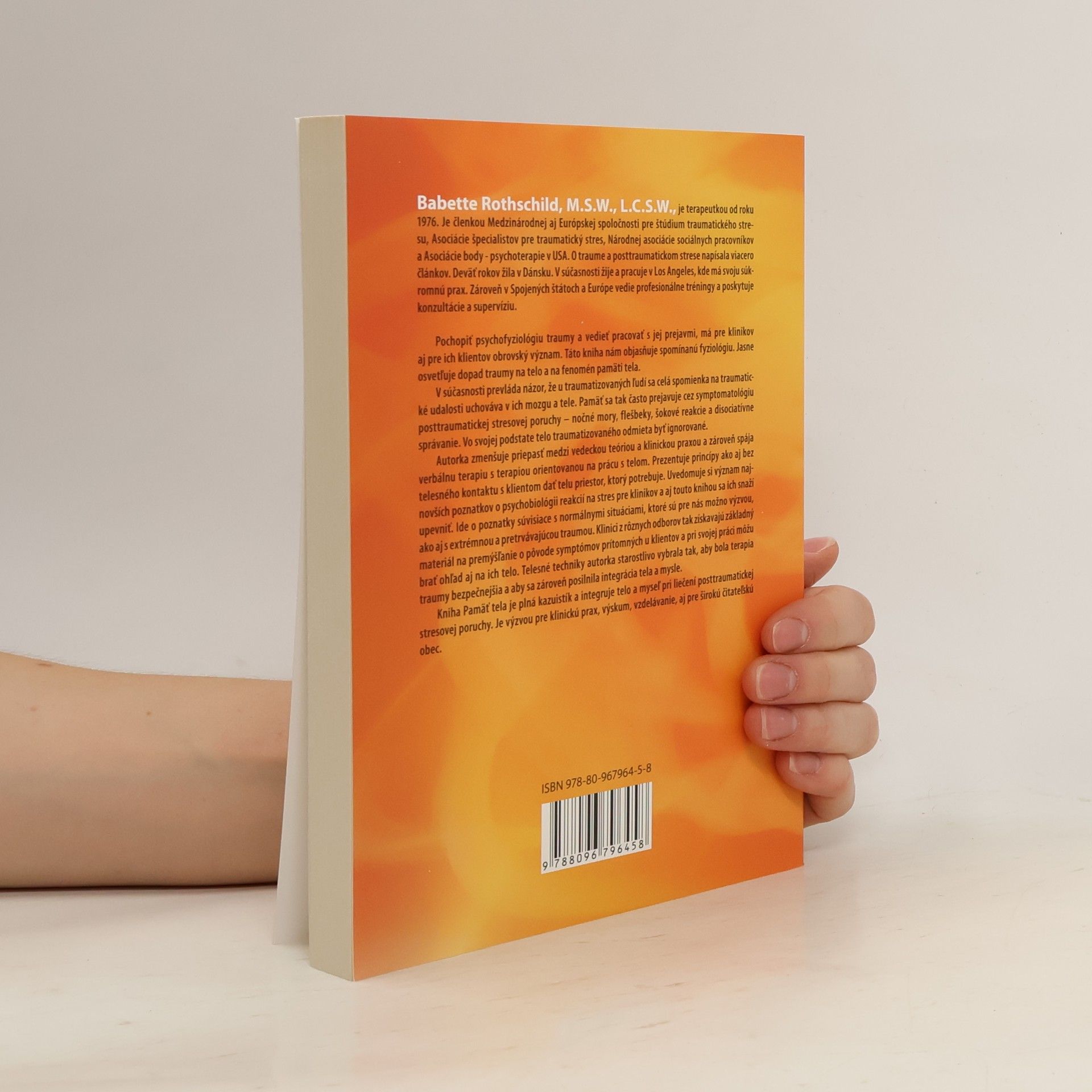 Pochopenie psychofyziológie traumy a schopnosť pracovať s jej prejavmi je pre klinikov a ich klientov kľúčové. Kniha objasňuje fyziológiu traumy a jej dopad na telo, vrátane fenoménu pamäti tela. Prevladá názor, že traumatizovaní ľudia uchovávajú spomienky na traumatické udalosti v mozgu a tele, čo sa často prejavuje cez symptómy posttraumatickej stresovej poruchy, ako sú nočné mory, flešbeky a disociatívne správanie. Telo traumatizovaného sa odmieta ignorovať. Autorka zmenšuje priepasť medzi vedeckou teóriou a klinickou praxou, spájajúc verbálnu terapiu s terapiou orientovanou na telo. Predstavuje princípy, ako dať telu priestor aj bez fyzického kontaktu s klientom. Uznáva význam psychobiológie reakcií na stres a ponúka poznatky o normálnych i extrémnych traumatických situáciách. Klinici z rôznych odborov získavajú materiál na premýšľanie o symptómoch u klientov a môžu zohľadniť aj ich telo. Autorka starostlivo vybrala telesné techniky, aby terapia bola bezpečnejšia a posilnila integráciu tela a mysle. Kniha je plná kazuistík a integruje telo a myseľ pri liečení posttraumatickej stresovej poruchy, čím predstavuje výzvu pre klinickú prax, výskum a vzdelávanie.
