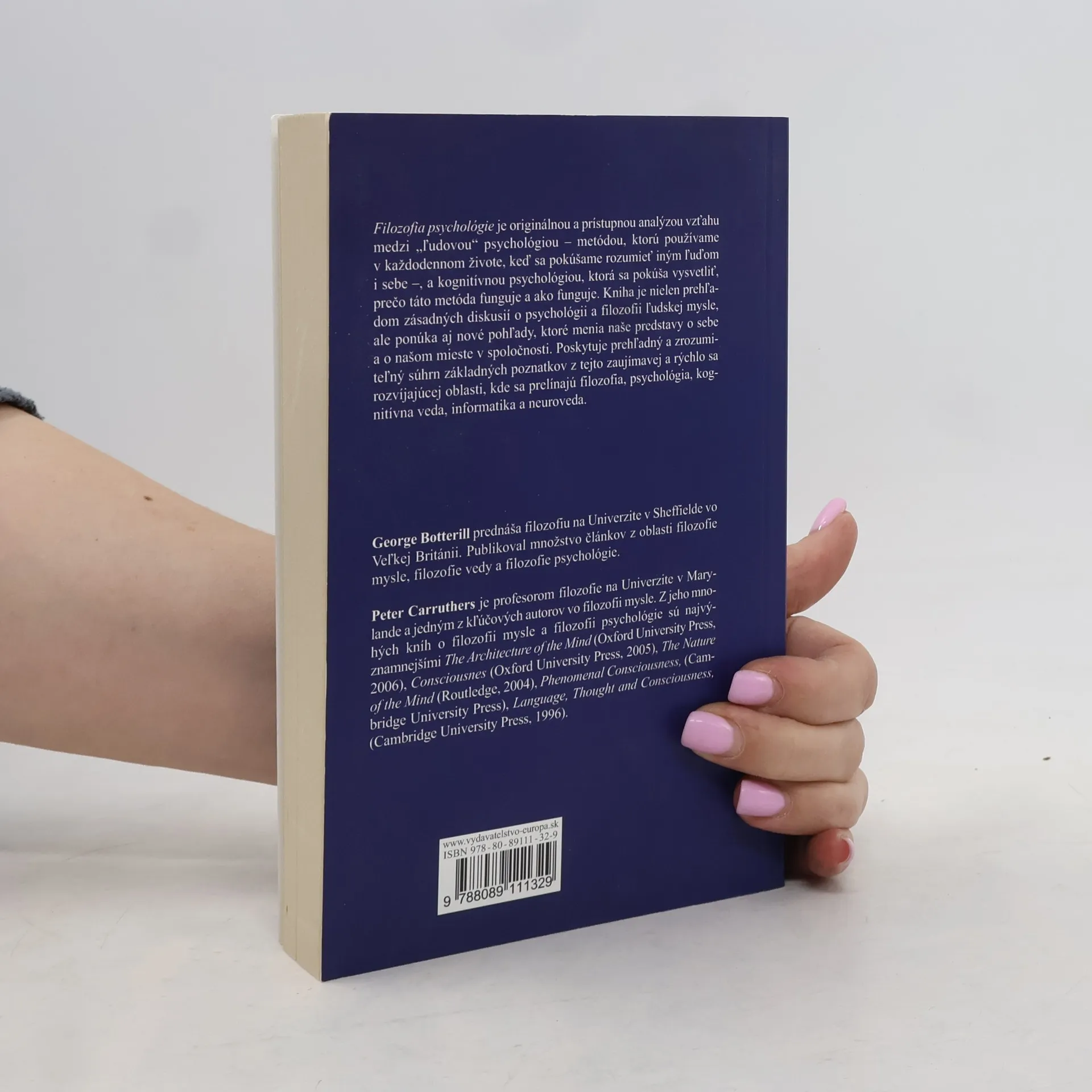 Filozofia psychológie je originálnou a prístupnou analýzou vzťahu medzi "ľudovou" psychológiou - metódou, ktorú používame v každodennom živote, keď sa pokúšame rozumieť iným ľuďom i sebe - a kognitívnou psychológiou, ktorá sa pokúša vysvetliť, prečo táto metóda funguje a ako funguje. Kniha je nielen prehľadom zásadných diskusií o psychológii a filozofii ľudskej mysle, ale ponúka aj nové pohľady, ktoré menia naše predstavy o sebe a o našom mieste v spoločnosti. Poskytuje prehľadný a zrozumiteľný súhrn základných poznatkov z tejto zaujímavej a rýchlo sa rozvíjajúcej oblasti, kde sa prelínajú filozofia, psychológia, kognitívna veda, informatika a neuroveda. George Botterill prednáša filozofiu na Univerzite v Sheffielde vo Veľkej Británii. Publikoval množstvo článkov z oblasti filozofie mysle, filozofie vedy a filozofie psychológie. Peter Carruthers je profesorom filozofie na Univerzite v Marylande a jedným z kľúčových autorov vo filozofii mysle. Z jeho mnohých kníh o filozofii mysle a filozofii psychológie sú najvýznamnejšími The Architecture of the Mind (Oxford University Press, 2006), Consciousnes (Oxford University Press, 2005), The Nature of the Mind (Routledge, 2004), Phenomenal Consciousness, (Cambridge University Press), Language, Thought and Consciousness, (Cambridge University Press, 1996).