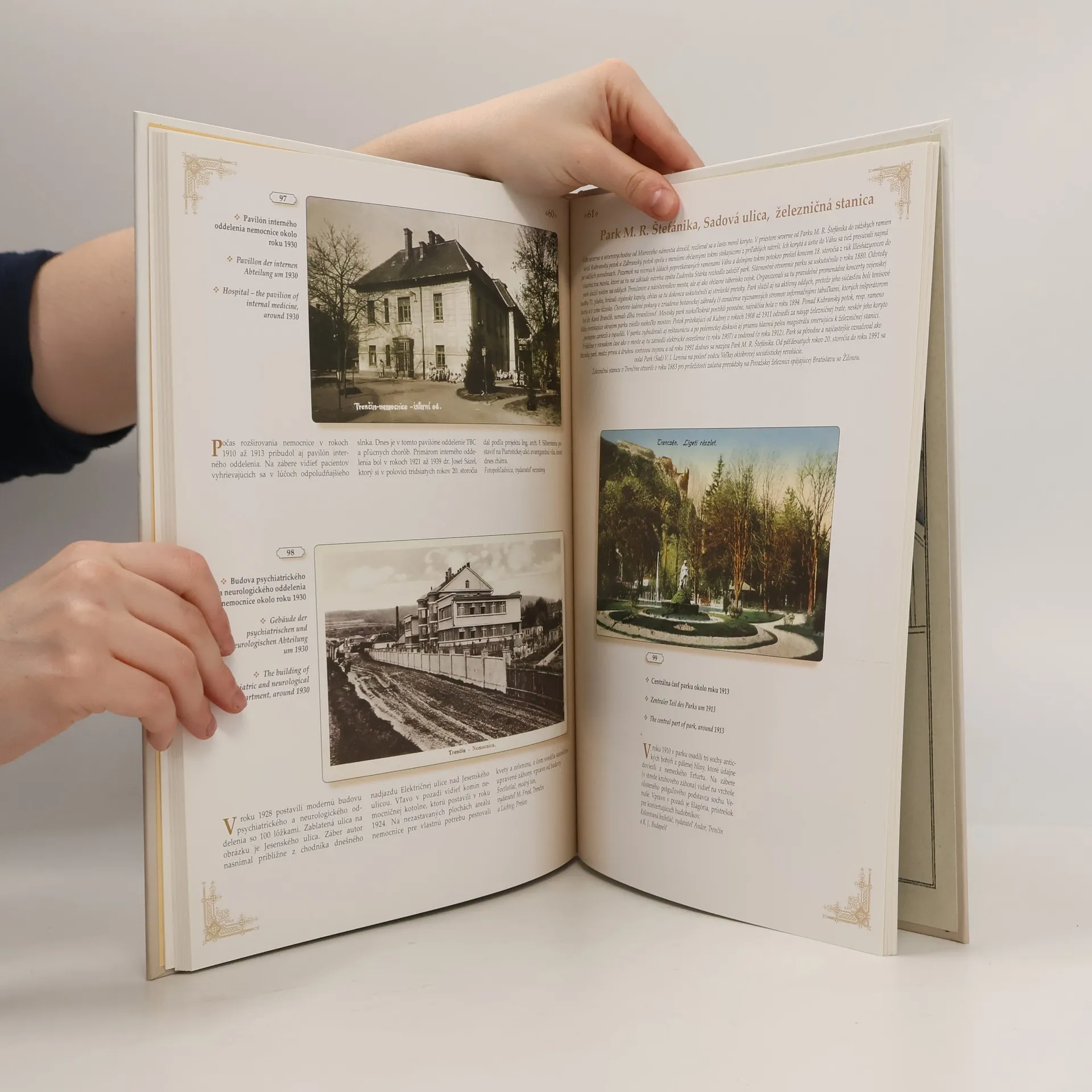 Publikácia Trenčín na starých pohľadniciach, zobrazuje na 96tich stranách 158 pohľadníc z obdobia rokov 1889 až 1950, reprodukovaných v mierke 11. Autor Ján Hanušin ponúka obraz mesta tak, ako ho za viac ako polstoročie zachytili početní fotografisti. Obsah ÚVOD 3 NÁČRT HISTÓRIE POHĽADNÍC OD ICH VZNIKU PO ROK 1950 4 AKO VZNIKÁ POHĽADNICA 5 STRUČNÁ HISTÓRIA POHĽADNÍC NA SLOVENSKU 6 VYDÁVANIE POHĽADNÍC V TRENČÍNE 7 Pohľady na mesto spoza Váhu, mosty 9 Hrad z Breziny, Brezina 15 Mierové námestie 19 Sládkovičova ulica, Štúrovo námestie, synagóga 28 Palackého ulica 34 Námestie SNP a hotel Tatra 37 Hviezdoslavova a Vajanského ulica, evanjelický kostol, hotel Trenčan 41 Rozmarínová ulica a ľavostranné predmostie cestného mosta 47 Ulica 1. mája a Kollárova štvrť 49 Námestie sv. Anny, Legionárska ulica 53 Nemocnica 59 Park M. R. Štefánika, Sadová ulica, železničná stanica 61 Štefánikova ulica a Kasárne SNP 67 Priemyselný areál vo východnej časti mesta (Pod Sokolicami) 73 Horná Sihoť 75 Stredná a južná časť mesta, Zámostie 79 Pričlenené obce 84 Litografické pohľadnice, koláže 88 POUŽITÁ LITERATÚRA 93 ZUSAMMENFASSUNG 94 SUMMARY 95