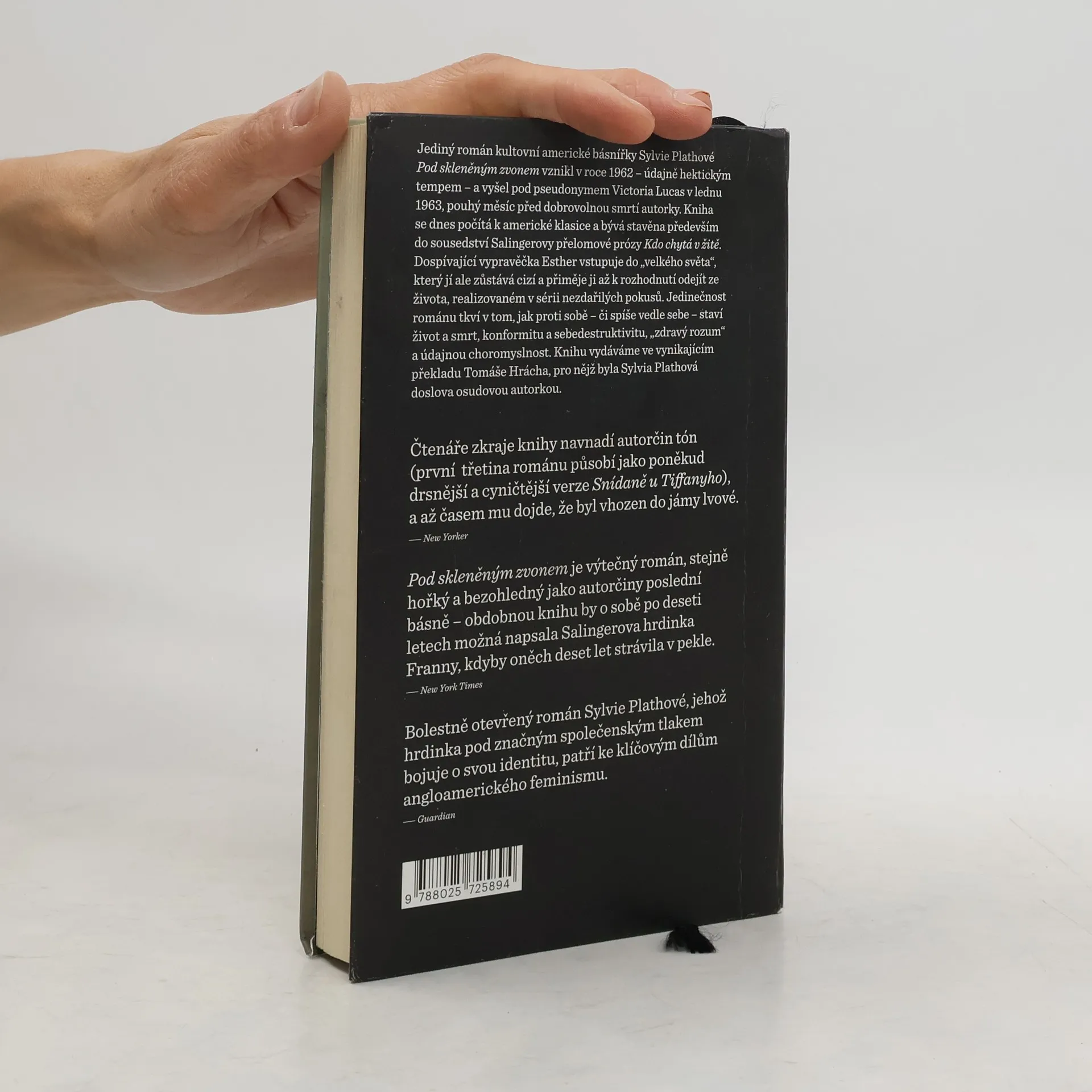 Jediný román kultovní americké básnířky Sylvie Plathové Pod skleněným zvonem vznikl v roce 1962 – údajně hektickým tempem – a vyšel pod pseudonymem Victoria Lucas v lednu 1963, pouhý měsíc před dobrovolnou smrtí autorky. Kniha se dnes počítá k americké klasice a bývá stavěna především do sousedství Salingerovy přelomové prózy Kdo chytá v žitě. Dospívající vypravěčka Esther vstupuje do „velkého světa“, který jí ale zůstává cizí a přiměje ji až k rozhodnutí odejít ze života, realizovaném v sérii nezdařených pokusů. Jedinečnost románu tkví v tom, jak proti sobě – či spíše vedle sebe – staví život a smrt, konformitu a sebedestruktivitu, „zdravý rozum“ a údajnou choromyslnost. Knihu vydáváme ve vynikajícím překladu Tomáše Hrácha, pro nějž byla Sylvia Plathová doslova osudovou autorkou, a s doslovem Martina Pokorného.