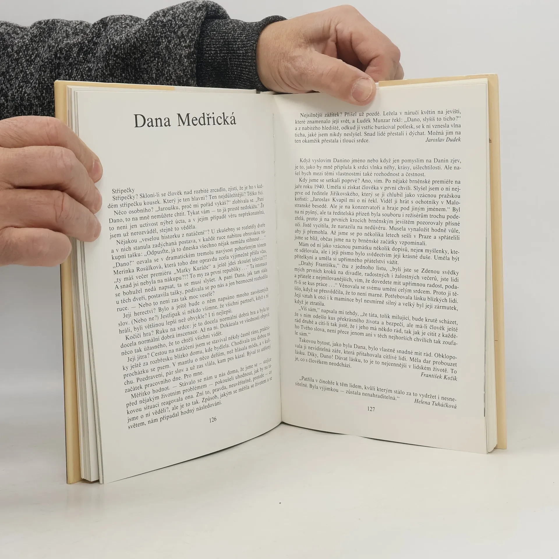 Dana Medřická vytvořila na jevištích, ve filmech, v rozhlasu a televizi na sta dramatických postav. V trvalé paměti obecenstva zůstala především její divadelní a filmová Slávka Hlubinová, Líza z Obchodníka s deštěm, Erži Orbánová z Kočičí hry a titulní postava ze hry Romeo a Julie na konci listopadu. Role, do nichž vložila kus vlastního života a mimořádný prožitek, který divák vycítil. Vznikla vzácná "zpětná vazba", dojem, že herečka oslovuje právě jeho a on má potřebu jí za to poděkovat, svěřit se se svými starostmi, zkrátka reagovat. Svědčí o tom desítky soukromých dopisů, jež Dana Medřická od neznámých lidí dostávala a bylo-li vhodné, i na ně odpovídala. Je zvláštní, že teprve nyní, poprvé, vychází tato kniha - vzpomínka. Otevírá ji vlastní vyprávění umělkyně, přibližující její dětství, dospívání a počáteční angažmá v Brně, Plzni, pak v pražské Uranii. Psala je jako úvodní kapitoly své chystané knihy, již však nestihla dokončit - zůstala torzem. Svazek uzavírá rovněž svědectví osobní - jejího syna Václava Vydry nejml., třetího pokračovatele tradice slavného hereckého rodu. Mezi nimi jsou kapitoly sestavené divadelní kritičkou Bohumilou Spisarovou z rozličných dokumentů, kritik, deníků. Plasticky z nich vystupuje osobnost Dany Medřické, herečky, která skutečně byla "naše".