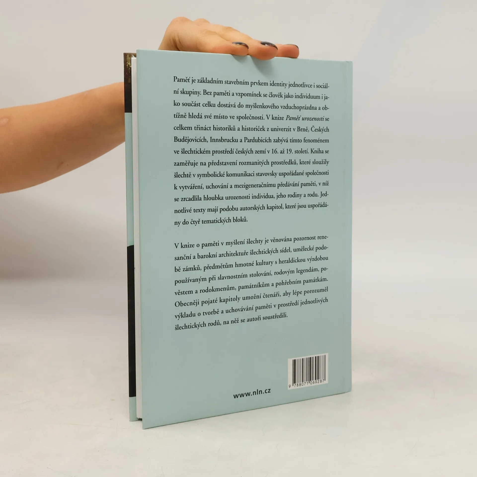 Kniha o paměti v myšlení šlechty od 16. do 19. století je výsledkem badatelského úsilí několika historiků a historiků umění mladší a střední generace z Brna, Českých Budějovic, Innsbrucku a Pardubic. Hlavní téma knihy směřuje k představení rozmanitých prostředků, které sloužily šlechtě v symbolické komunikaci stavovsky uspořádané společnosti k vytváření, uchovávání a předávání paměti, v níž se zrcadlila hloubka urozenosti individua, jeho rodiny a rodu.