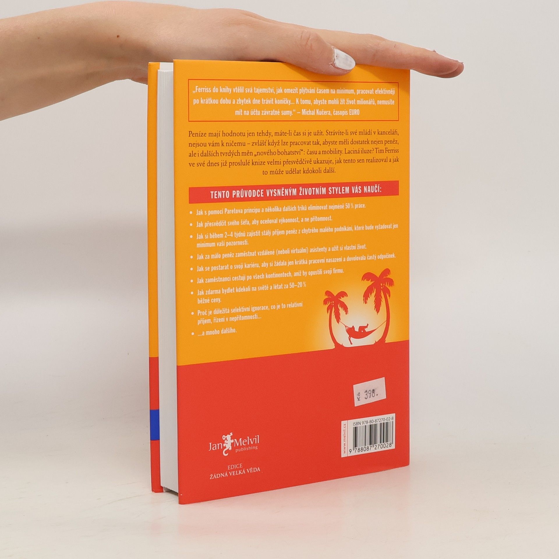Peníze mají hodnotu jen tehdy, máte-li čas si je užít. Strávíte-li své mládí v kanceláři, nejsou vám k ničemu zvlášť když lze pracovat tak, abyste měli dostatek nejen peněz, ale i dalších tvrdých měn nového bohatství: času a mobility. Laciná iluze? Tim Ferriss ve své dnes již proslulé knize velmi přesvědčivě ukazuje, jak tento sen realizoval a jak to může udělat kdokoli další. Kniha je světovým bestsellerem a vyšla v 35 zemích.