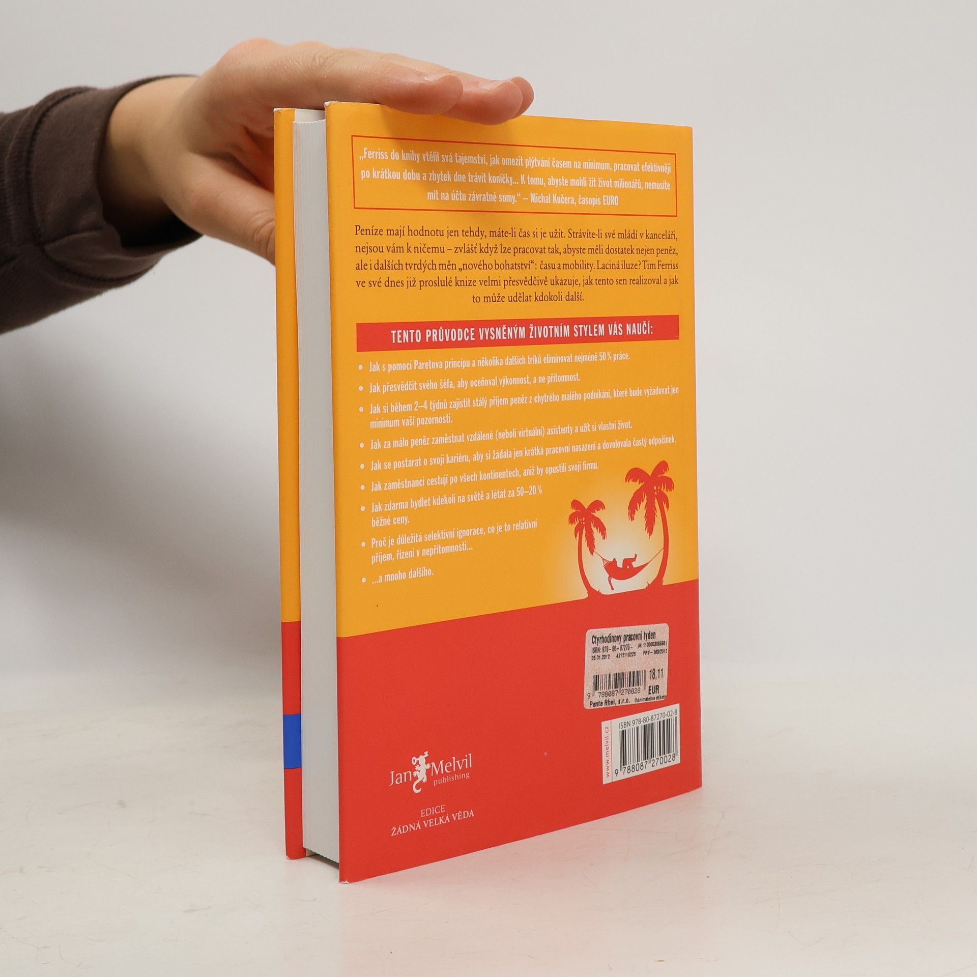 Peníze mají hodnotu jen tehdy, máte-li čas si je užít. Strávíte-li své mládí v kanceláři, nejsou vám k ničemu zvlášť když lze pracovat tak, abyste měli dostatek nejen peněz, ale i dalších tvrdých měn nového bohatství: času a mobility. Laciná iluze? Tim Ferriss ve své dnes již proslulé knize velmi přesvědčivě ukazuje, jak tento sen realizoval a jak to může udělat kdokoli další. Kniha je světovým bestsellerem a vyšla v 35 zemích.