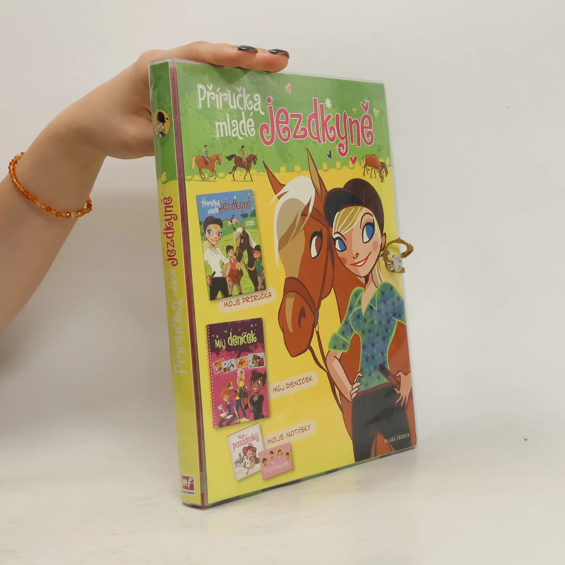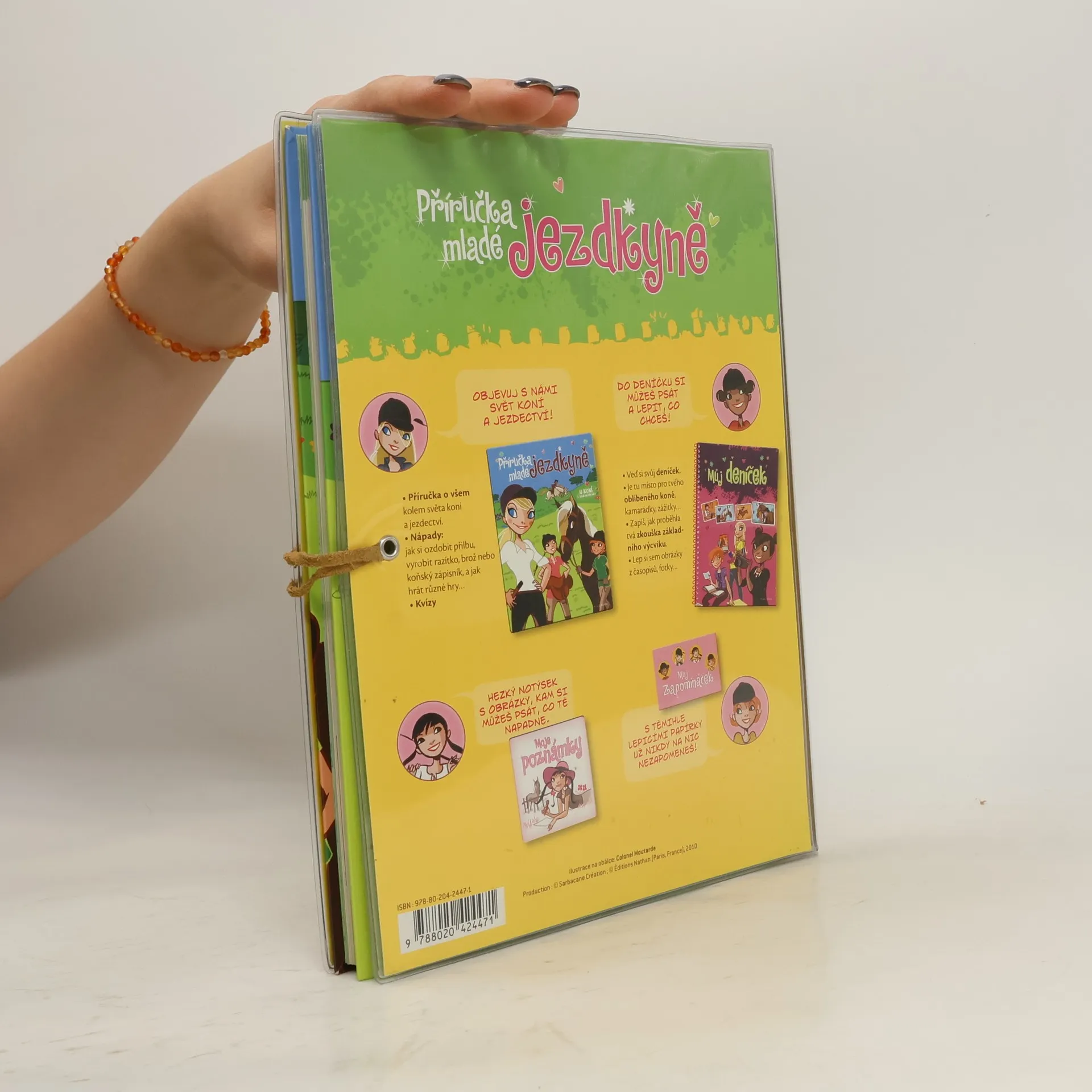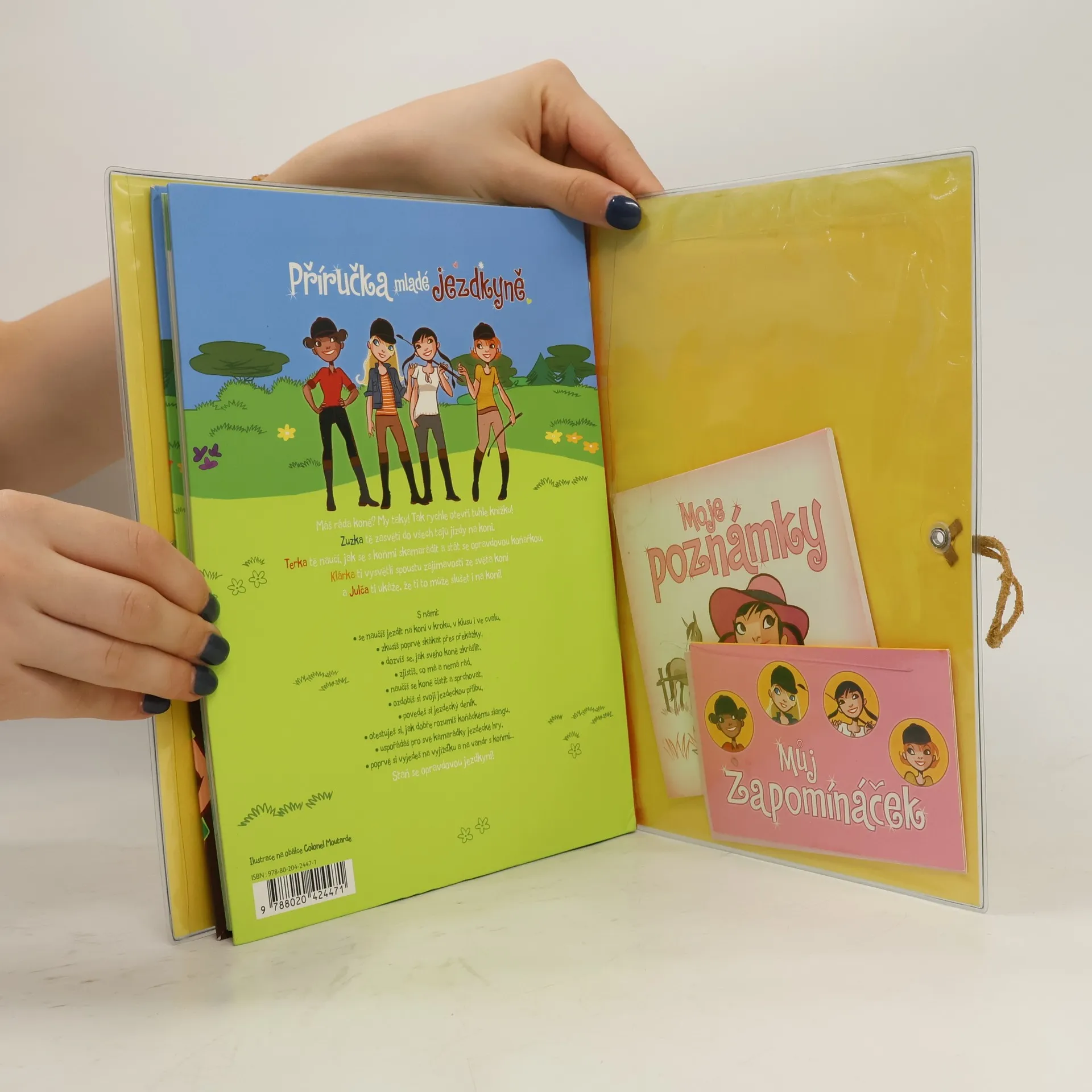Tuto příručku ocení všechny milovnice koní. Textem se spoustou ilustrací je provedou čtyři kamarádky, které o koních a jezdectví vědí úplně všechno. Zuzka je výborná jezdkyně a s přehledem zvládá všechno od prvních lekcí na jízdárně až po zkoušky základního výcviku jezdce. Terka trpělivě vysvětluje, jak s koňmi zacházet, Klárka je zase odbornicí na všechna možná plemena koní a historii jezdectví. A konečně Julča je tu přes estetickou stránku věci - jezdkyně i její kůň musí být vždy upraveni! Na mladé čtenářky čekají vedle kvízových otázek a testů i návody pro šikovné ruce. Praktický omyvatelný obal navíc skrývá dva krásné notýsky a deníček, do kterého se dají zapisovat zážitky a lepit fotky.