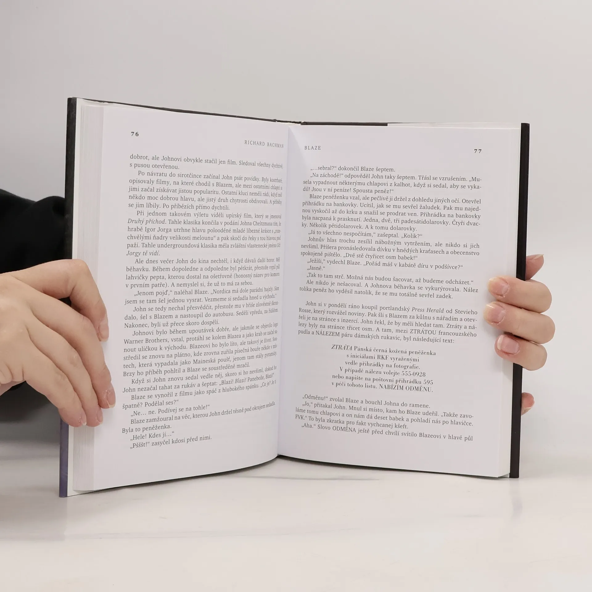Nová kniha Stephena Kinga napsaná pod pseudonymem Richard Bachman. * Claytonu Blaisdellovi mladšímu, přezdívanému Blaze, to kvůli dávnému úrazu hlavy (otec ho totiž kdysi jako malého shodil ze schodů) moc dobře nemyslí. Protřelý kriminálník George Rackley, s nímž se po svém útěku z chlapeckého ústavu seznámí, mu nasadí do hlavy „ohromný“ nápad unést dítě z bohaté rodiny. Že to zní jako tuctová kriminálka? Autor však, jak je jeho zvykem, dál míchá karty. Než se parťákům podaří plán, který by mohl vynést miliony dolarů, uskutečnit, kápo George zemře (nebo snad ne?). Blaze, odkázaný teď sám na sebe, si ve sněhové bouři odnáší dítě jako rukojmí, policajti jsou mu v patách a celý ten „do detailu promyšlený zločin“ se v bílém pekle lesů v Maine najednou mění v závod s časem. King v novém románu se strhujícím dějem a napětím oživil rukopis z raného „bachmanovského“ období. Hromotluk Blaze je sice zločinec, ale málokterý románový hrdina budí tolik soucitu a sympatií.