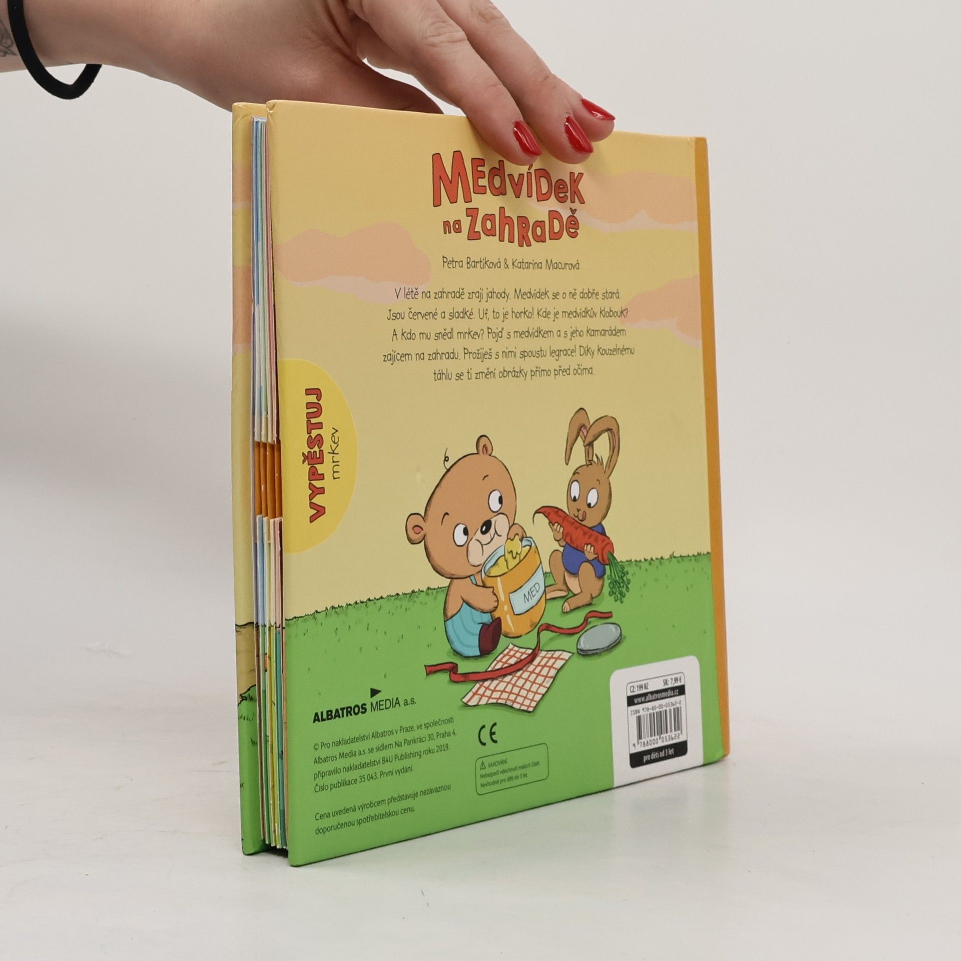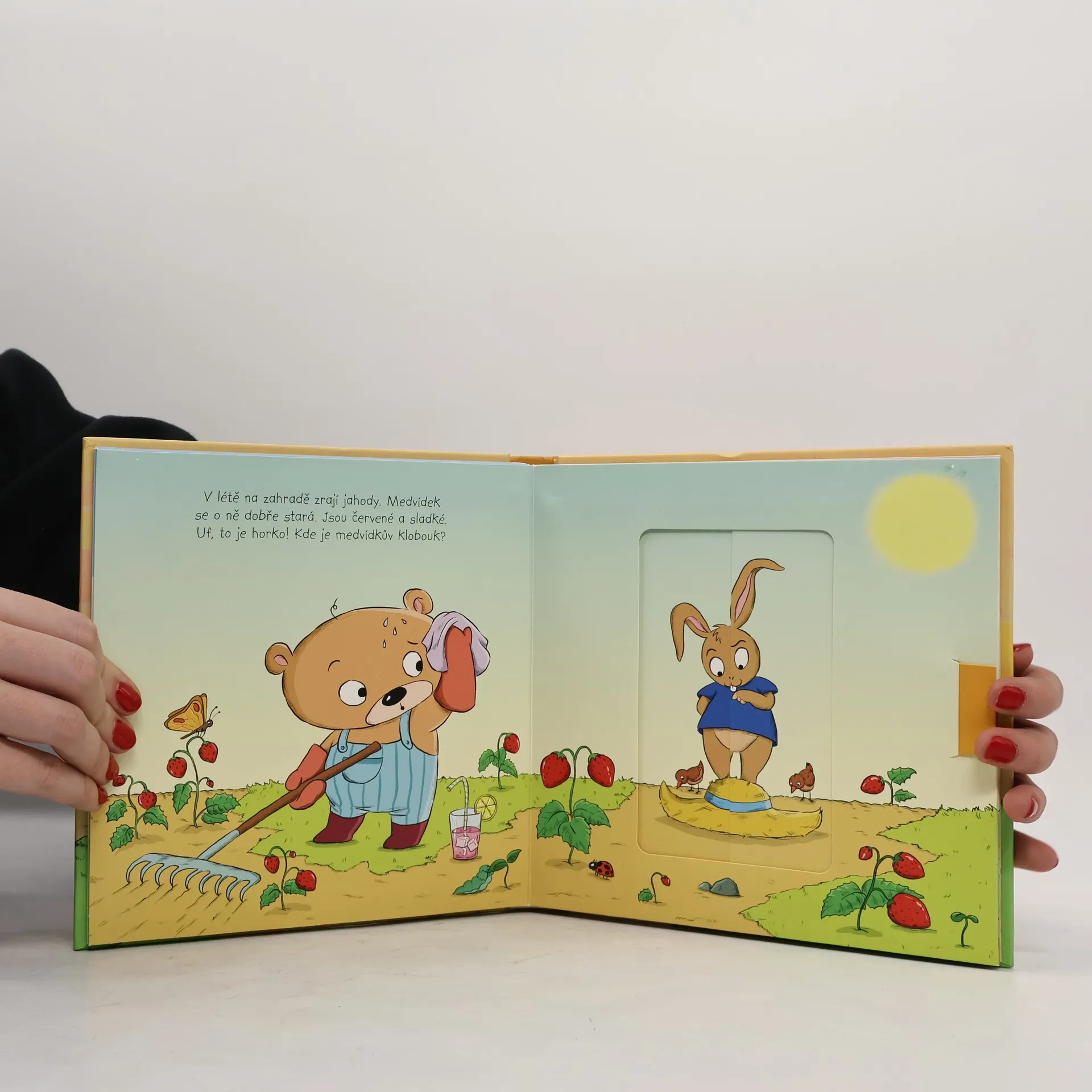 V létě na zahradě zrají jahody. Medvídek se o ně dobře stará. Jsou červené a sladké. Uf, to je horko! Kde je medvídkův klobouk? A kdo mu snědl mrkev? Pojď s medvídkem a s jeho kamarádem zajícem na zahradu. Prožiješ s nimi spoustu legrace! Díky kouzelnému táhlu se ti změní obrázky přímo před očima.