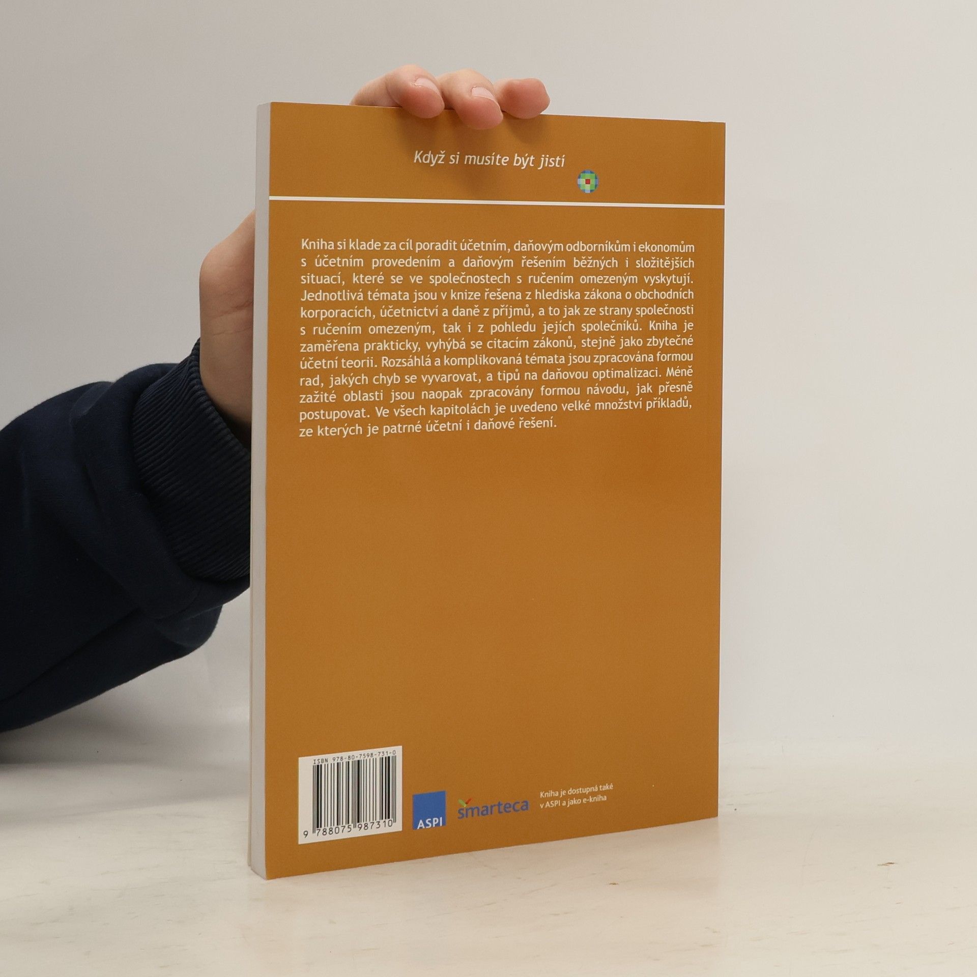 Kniha si klade za cíl poradit účetním, daňovým odborníkům i ekonomům s účetním provedením a daňovým řešením běžných situací, které se ve společnostech s ručením omezeným vyskytují. Jednotlivá témata jsou v knize řešena z hlediska zákona o obchodních korporacích, účetnictví a daně z příjmů, a to jak ze strany společnosti s ručením omezeným, tak i z pohledu jejích společníků. Kniha je zaměřena prakticky, vyhýbá se citacím zákonů, stejně jako zbytečné účetní teorii. Rozsáhlá a komplikovaná témata jsou zpracována formou rad, jakých chyb se vyvarovat, a tipů na daňovou optimalizaci. Méně zažitá témata jsou naopak zpracována formou návodu, jak přesně postupovat. Ke všem tématům je uvedeno velké množství příkladů, ze kterých je patrné účetní i daňové řešení. Kniha je zpracována podle legislativy platné k 1. 1. 2018.