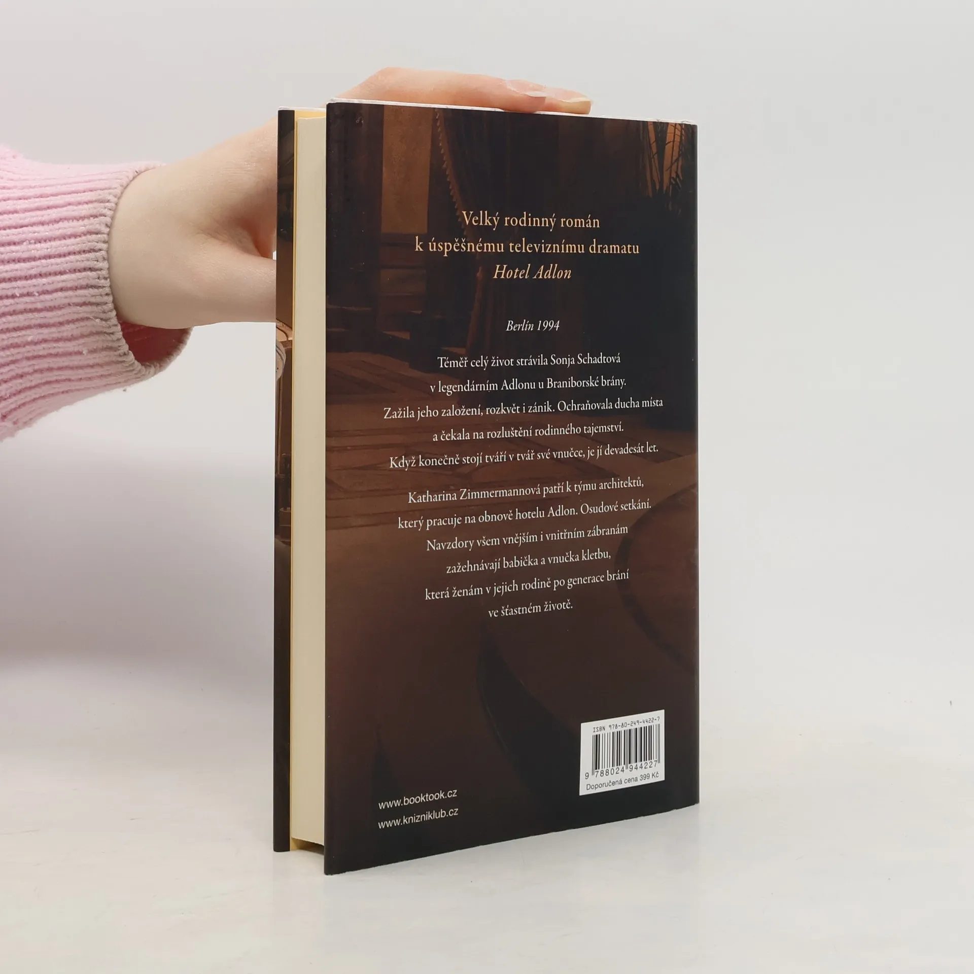 Barvitá rodinná historie, která začíná lží a končí láskou. Rodica Doehnertová, autorka scénáře úspěšné třídílné televizní série Hotel Adlon, nechává ve své knize znovu ožít strhující historii legendárního grandhotelu a rodin Schadtových a Adlonových. Mistrovsky přitom klene oblouk od založení hotelu v době císařství až k jeho novému otevření ve sjednoceném Německu. Rodinnými ságami Hotel Adlon a Hotel Sacher nadchla miliony diváků po celém světě a obrodila žánr televizního románu.