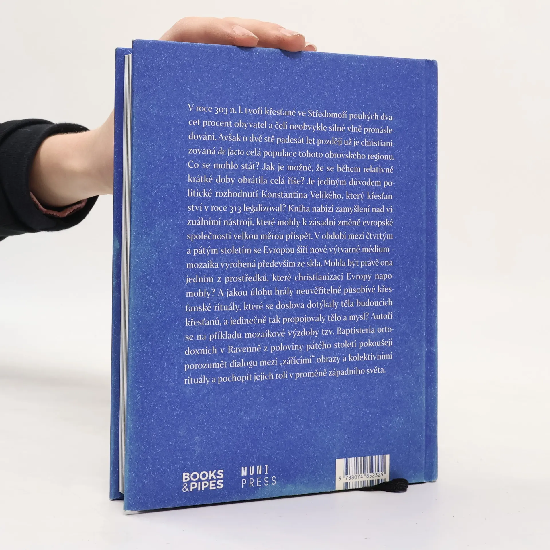 V roce 303 n. l. tvoří křesťané ve Středomoří pouhých dvacet procent obyvatel a čelí neobvykle silné vlně pronásledování. Avšak o dvě stě padesát let později už je christianizovaná de facto celá populace tohoto obrovského regionu. Co se mohlo stát? Jak je možné, že se během relativně krátké doby obrátila celá říše? Je jediným důvodem politické rozhodnutí Konstantina Velikého, který křesťanství v roce 313 legalizoval? Kniha nabízí zamyšlení nad vizuálními nástroji, které mohly k zásadní změně evropské společnosti velkou měrou přispět. V období mezi čtvrtým a pátým stoletím se Evropou šíří nové výtvarné médium – mozaika vyrobená především ze skla. Mohla být právě ona jedním z prostředků, které christianizaci Evropy napomohly? A jakou úlohu hrály neuvěřitelně působivé křesťanské rituály, které se doslova dotýkaly těla budoucích křesťanů, a jedinečně tak propojovaly tělo a mysl? Autoři se na příkladu mozaikové výzdoby tzv. Baptisteria ortodoxních v Ravenně z poloviny pátého století pokoušejí porozumět dialogu mezi „zářícími“ obrazy a kolektivními rituály a pochopit jejich roli v proměně západního světa.