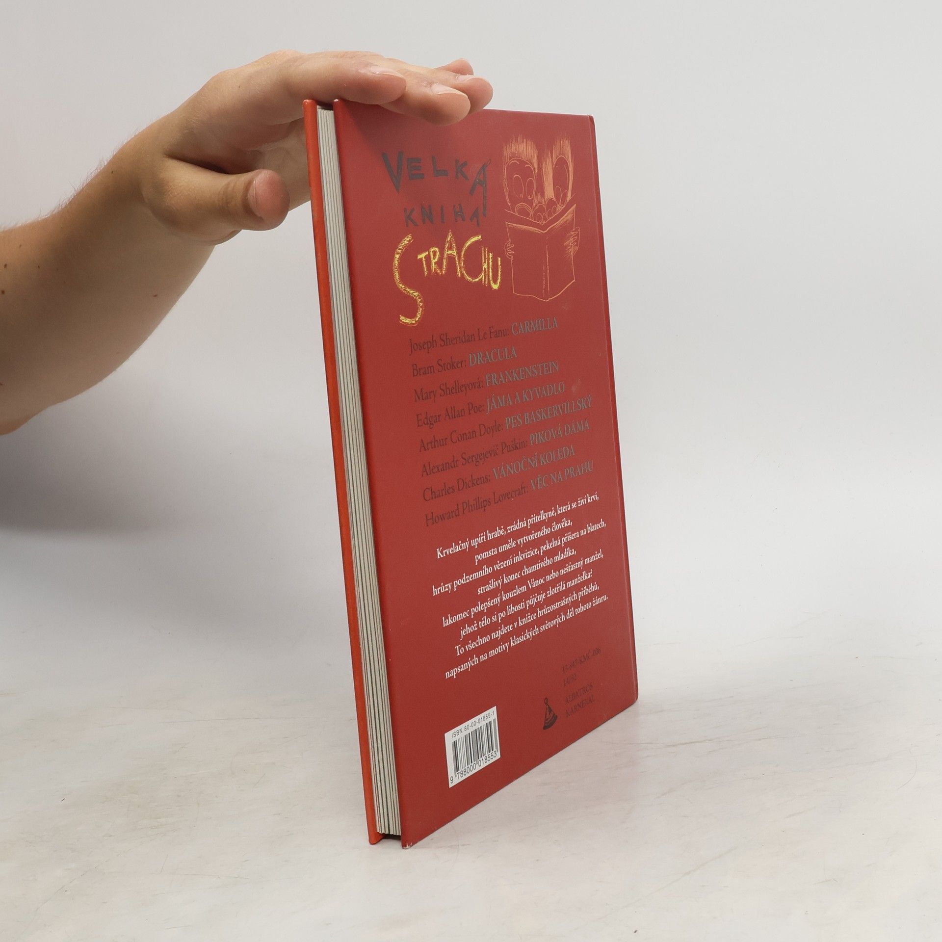 Krvelační upíří hrabě, zrádná přítelkyně, která se živí krví, pomsta uměle vytvořeného člověka, hrůzy podzemního vězení inkvizice, pekelná příšera na blatech, strašlivý konec chamtivého mladíka, lakomec polepšený kouzlem Vánoc nebo nešťastný manžel, jehož tělo si po libosti půjčuje zlotřilá manželka? To všechno najdete v knížce hrůzostrašných příběhů, napsaných na motivy klasických světových děl tohoto žánru. Příběhy, při jejichž čtení naskakuje husí kůže, lákaly a lákají autory od nepaměti. A čtenáři je s velikou oblibou hltají ve volných chvílích. Proto vznikl i sborník Velká kniha Strachu, ve kterém najdete zjednodušené verze klasických hrůzostrašných příběhů od slavných spisovatelů. Nepostradatelná knížka pro všechny, kdo se rádi bojí. Sestavila a převyprávěla Veronika Bohatá Povídky: - Joseph Sheridan Le Fanu: Carmilla - Bram Stoker: Dracula - Mary W. Shelley: Frankenstein - Edgar Allan Poe: Jáma a kyvadlo - Arthur Conan Doyle: Pes baskervillský - Alexandr Sergejevič Puškin: Piková dáma - Charles Dickens: Vánoční koleda - Howard Phillips Lovecraft: Věc na prahu