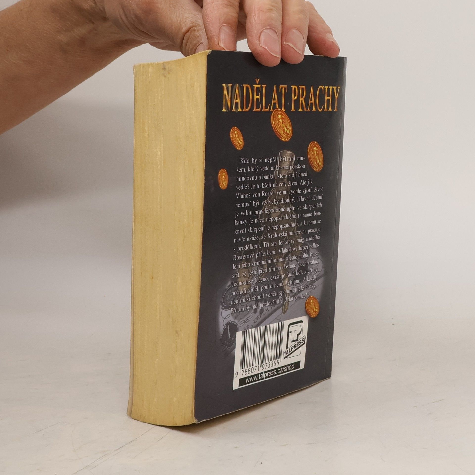 Kdo by si nepřál být tím mužem, který vede ankh-morporskou mincovnu a banku, která stojí hned vedle? Je to kšeft na celý život. Ale jak Vlahoš von Rosret velmi rychle zjistí, život nemusí být vždycky dlouhý. Hlavní účetní je velmi pravděpodobně upír, ve sklepeních banky je něco nepopsatelného (a samo bankovní sklepení je nepopsatelné), a k tomu navíc se ukáže, že Královská mincovna pracuje s prodělkem. Tři sta let starý mág nadbíhá Rosretově přítelkyni, Vlahošovi hrozí odhalení jeho kriminální minulosti, ale mohlo by se stát, že ještě před tím ho dostane Cech vrahů. Jednoduše řečeno, existuje řada lidí, kteří by ho rádi viděli pod drnem. Ach ano. A každý den musí chodit venčit spolumajitele banky. Přitom by měl především... dělat peníze! Úžasná Zeměplocha, kniha 32., přeložil Jan Kantůrek.
