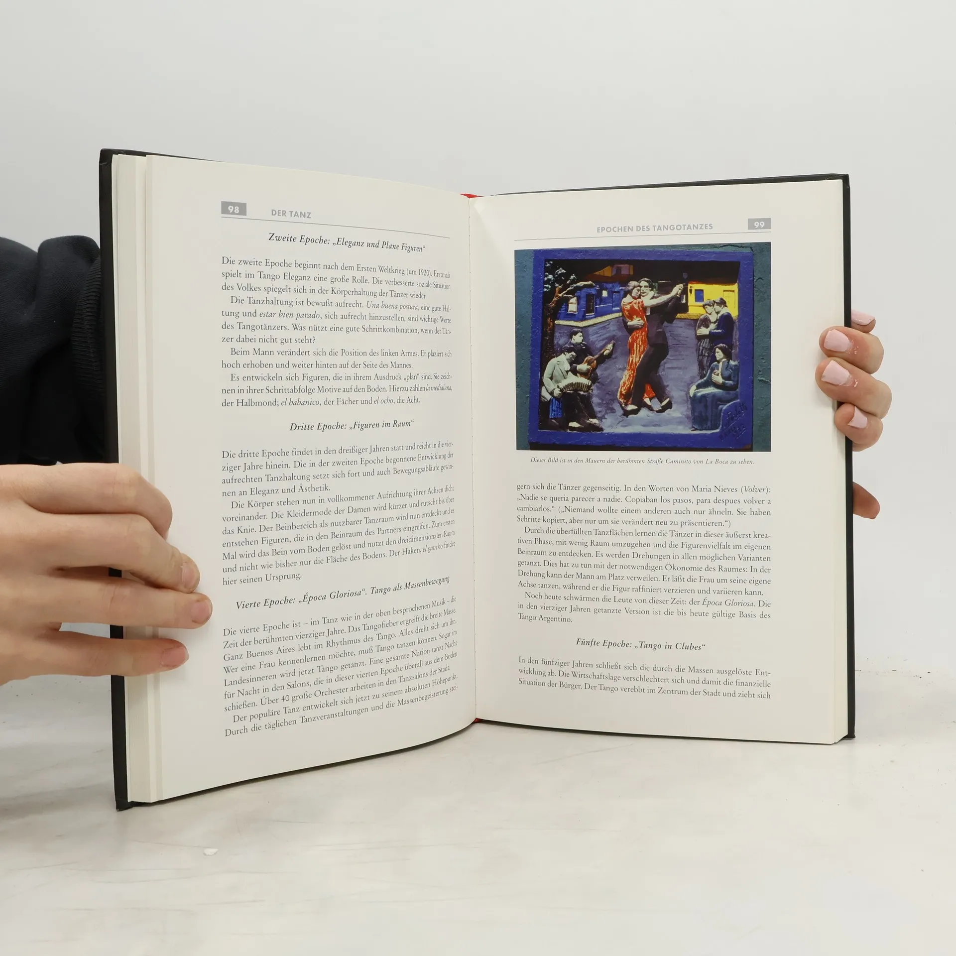 DIE WURZELN (Geburt u. Entwicklung, Musik) -- DER TANZ (Epochen, Stil, Figuren, Tango im Ausland) -- PHILOSOPHIE (Faszination, Wesen, Sonderstellung) -- TECHNIK (Körperstrukturen, Grundhaltung, Führen / Folgen, Bewegungsstrukturen, Bewegungsqualität, Lernprozesse, Meisterprüfung) -- KLEINES TANGO-LEXIKON (Chronik, Figurenübersicht, Spanisch für Tangofreunde, Register, Bibliographie)
