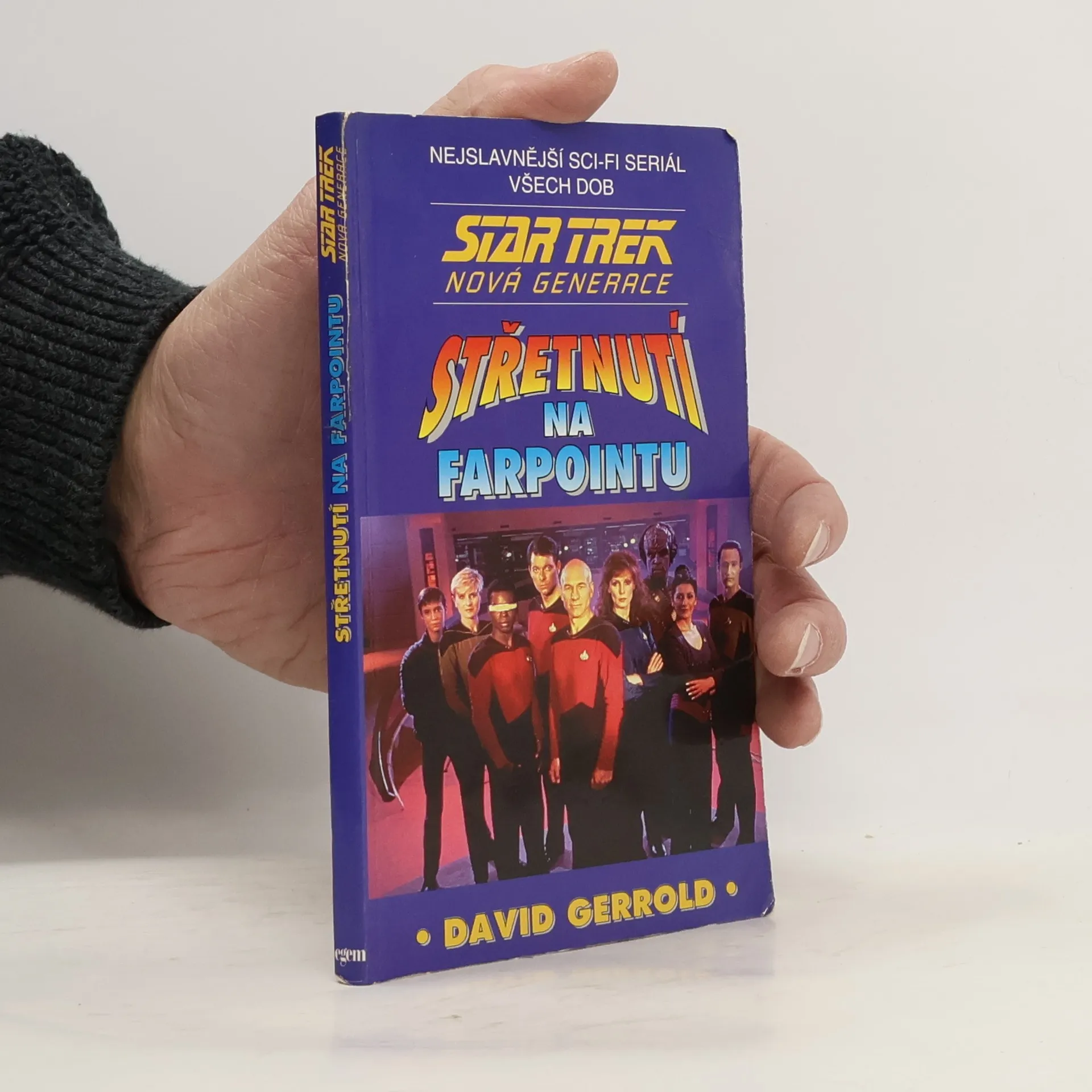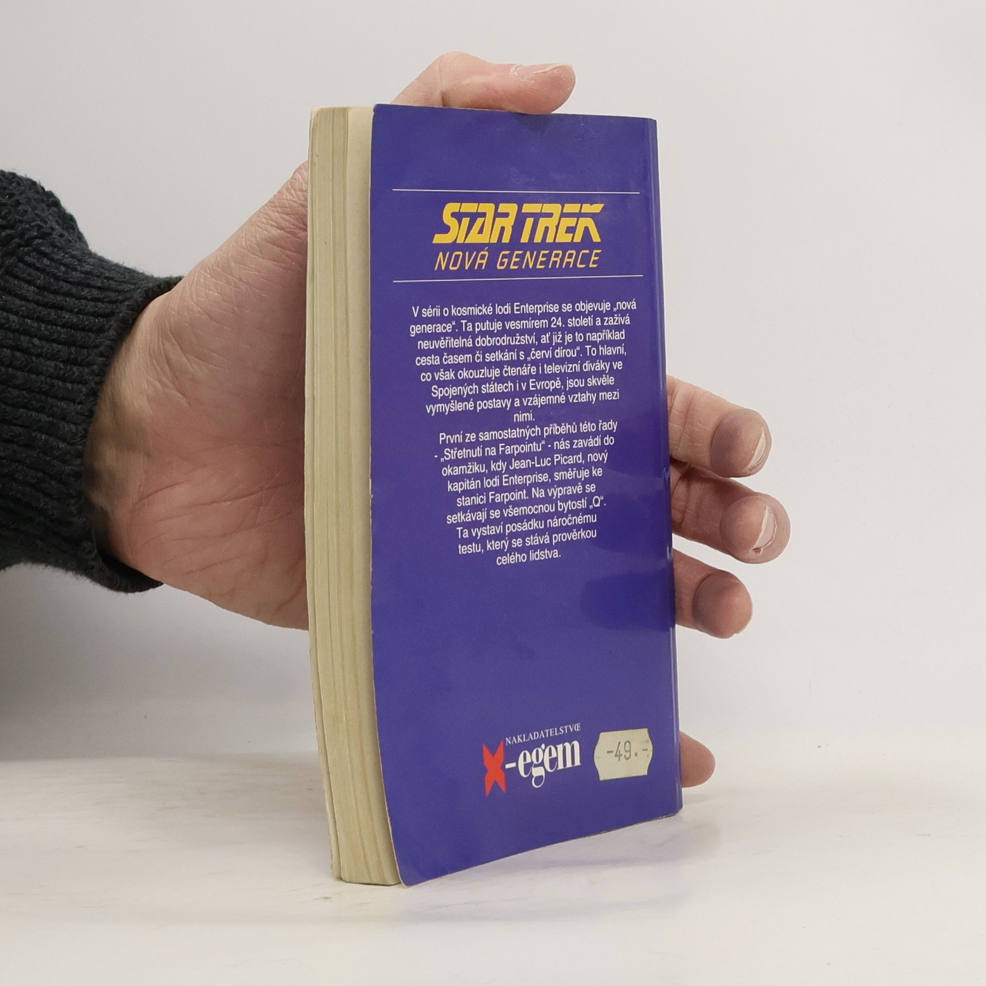 První ze samostatných příběhů této řady - Střetnutí na Farpointu - nás zavádí do okamžiku, kdy Jean-Luc Picard, nový kapitán lodi Enterprise, směřuje ke stanici Farpoint. Na výpravě se setkávají se všemocnou bytostí „Q". Ta vystaví posádku náročnému testu, který se stává prověrkou celého lidstva. Po velkém úspěchu první televizní série Star Trek se objevilo v roce 1987 její pokračování pod označením Nová generace. Nový typ vesmírné lodi Enterprise, na jejíž palubě žije přes tisíc osob, řídí posádka „nové generace" - kapitán Jean-Luc Pikard, první důstojník William Riker, android Dat, lodní poradkyně Deanna Troi, mladý slepý poručík Geordi La Forge a další. Vzápětí po příznivé odezvě televizních diváků ve Spojených státech i v Evropě se objevily i první romány, napsané osvědčenými autory americké sci-fi literatury.