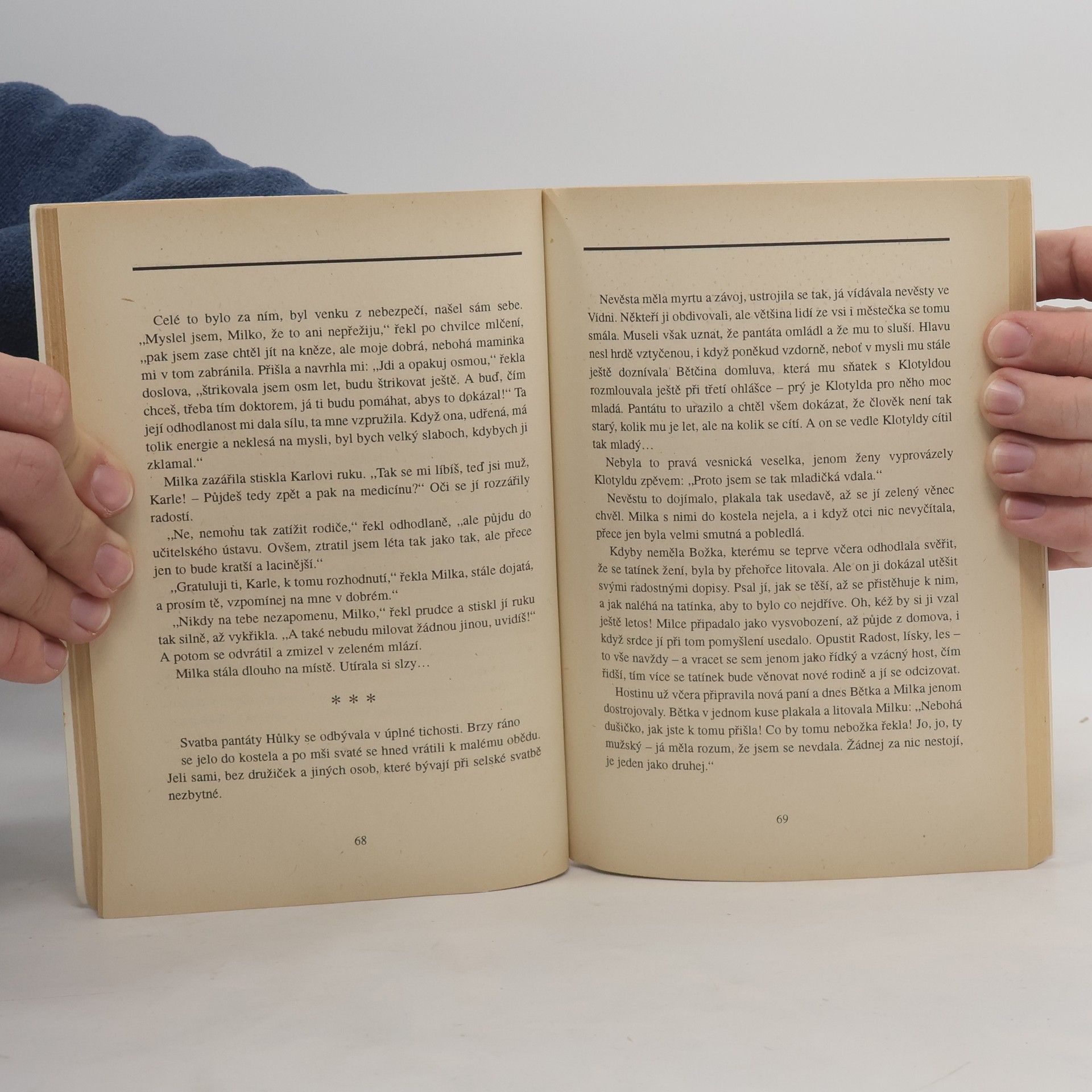 Románová novela z vesnického prostředí je situovaná do první poloviny 20. století a líčí osud příslušníků dvou rodin z malé české vesničky. Hrdinkou je mladá dcera místního sedláka, která spolu se synem hajného jako jediná z této malé samoty studuje ve městě. Oba mladí lidé jsou nejlepšími přáteli, po několika letech se ale chlapec do své kamarádky zamiluje. Ta se však mezitím zakoukala do selského syna, plánuje s ním společnou budoucnost a přítele z dětství s lítopstí odmítne. V lásce ji ale čeká zklamání a ona odchází do Prahy studovat medicínu. Po ukončení studia se vrací k nemocnému otci s úmyslem zařídit si v místě praxi. Její dávný kamarád ji nepřestal milovat, drží se ale stranou a jen jeho těžká nemoc otevře dívce oči k poznání, že si byli odjakživa souzeni. Toto vydání obsahuje navíc novelu: Před půl stoletím (53 stran)