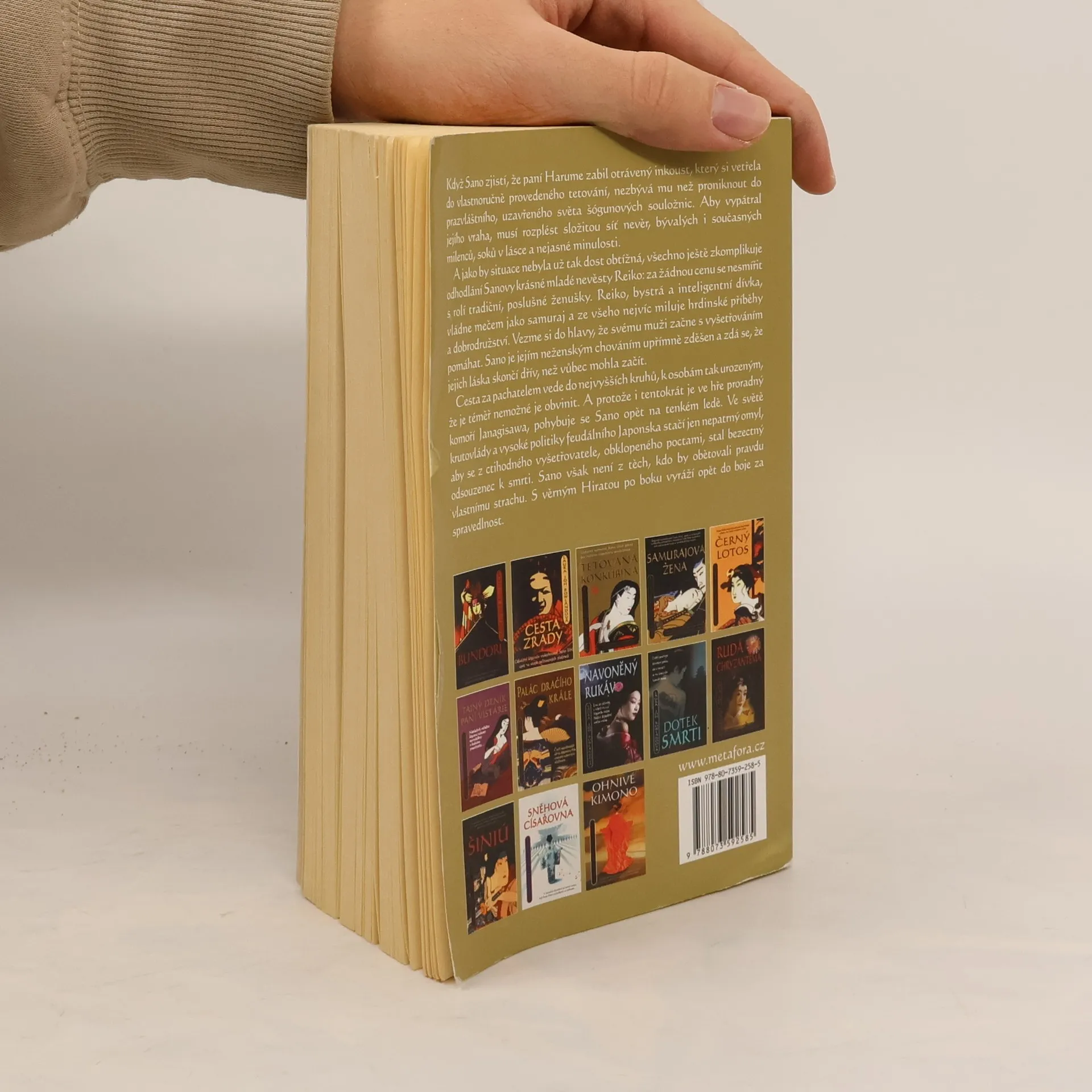 Historická detektivka z Japonska 17. stol., v němž statečný a inteligentní samuraj vyšetřuje vraždu císařské konkubíny. Mladý samuraj a vyšetřovatel Sano se právě žení na císařském dvoře, když svatební hostinu přeruší hrůzná vražda nejoblíbenější císařské konkubíny. Do velmi složitého vyšetřování zasahuje i Sanova bystrá mladá manželka, která se nechce smířit se svým tradičním podřízeným postavením japonské manželky. Sano je jejím neženským chováním naprosto zděšen a zdá se, že jejich manželství brzy skončí. Cesta za pachatelem vede do nejvyšších kruhů k osobám tak urozeným, že je téměř nemožné je obvinit. V kritických chvílích Sano pochopí i ocení pomoc své manželky. Výjimečná a poutavá četba z dávných a exotických časů představuje čtenáři úchvatný a pestrý svět starého Japonska.