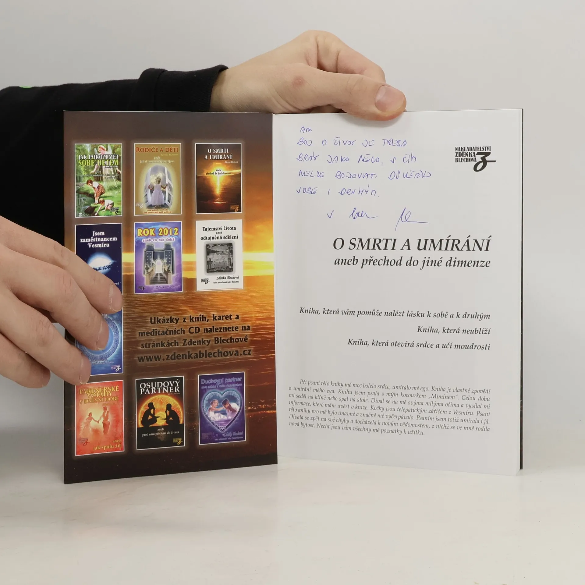 Kniha O SMRTI A UMÍRÁNÍ aneb přechod do jiné dimenze je kniha, která vám pomůže nalézt lásku k sobě a k druhým. Autorkou je známá spisovatelka Zdenka Blechová. Je to kniha, která neublíží, ale otevírá srdce a učí moudrosti. Pojednává o tom jak se smířit s odchodem druhých, jak jim pomoci a jak chápat smrt. Je to nejen smrt našeho těla, ale i smrt našeho ega, které umírá každým přerodem našeho myšlení. Kniha poutavě zaznamenává nejen příběhy osob, ale hovoří i o naší psychice. O tom, proč nechceme pustit své blízké a jak se máme na vše dívat. Tato kniha vychází jako druhé vydání a už pomohla tisícům lidí.