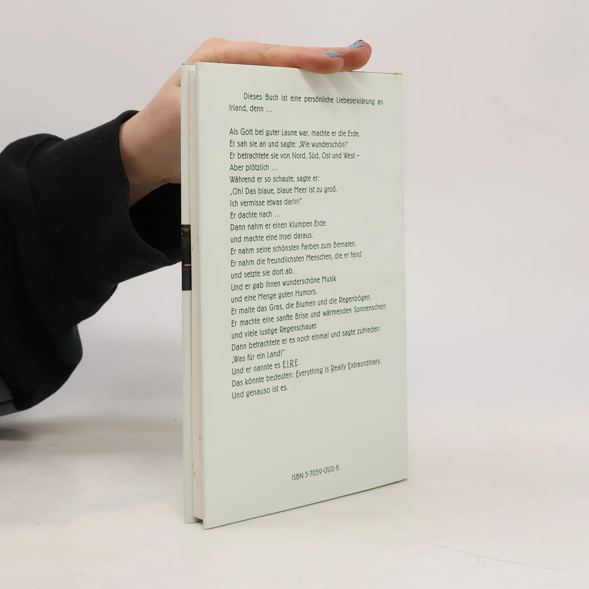 Dieses Buch ist eine persönliche Liebeserklärung an Irland, denn … Als Gott bei guter Laune war, machte er die Erde. Er sah sie an und sagte: „Wie wunderschön!“ Er betrachtete sie von Nord, Süd, Ost und West – Aber plötzlich … Während er so schaute, sagte er: „Oh! Das blaue, blaue Meer ist zu groß. Ich vermisse etwas darin!“ Er dachte nach … Dann nahm er einen Klumpen Erde und machte eine Insel daraus. Er nahm seine schönsten Farben zum Bemalen. Er nahm die freundlichsten Menschen, die er fand und setzte sie dort ab. Und er gab ihnen wunderschöne Musik und eine Menge guten Humors. Er malte das Gras, die Blumen und die Regenbögen. Er machte eine sanfte Brise und wärmenden Sonnenschein und viele lustige Regenschauer. Dann betrachtete er es noch einmal und sagte zufrieden: „Was für ein Land!“ Und er nannte es EIRE. Das könnte bedeuten: Everything Is Really Extraordinary. Und genauso ist es.