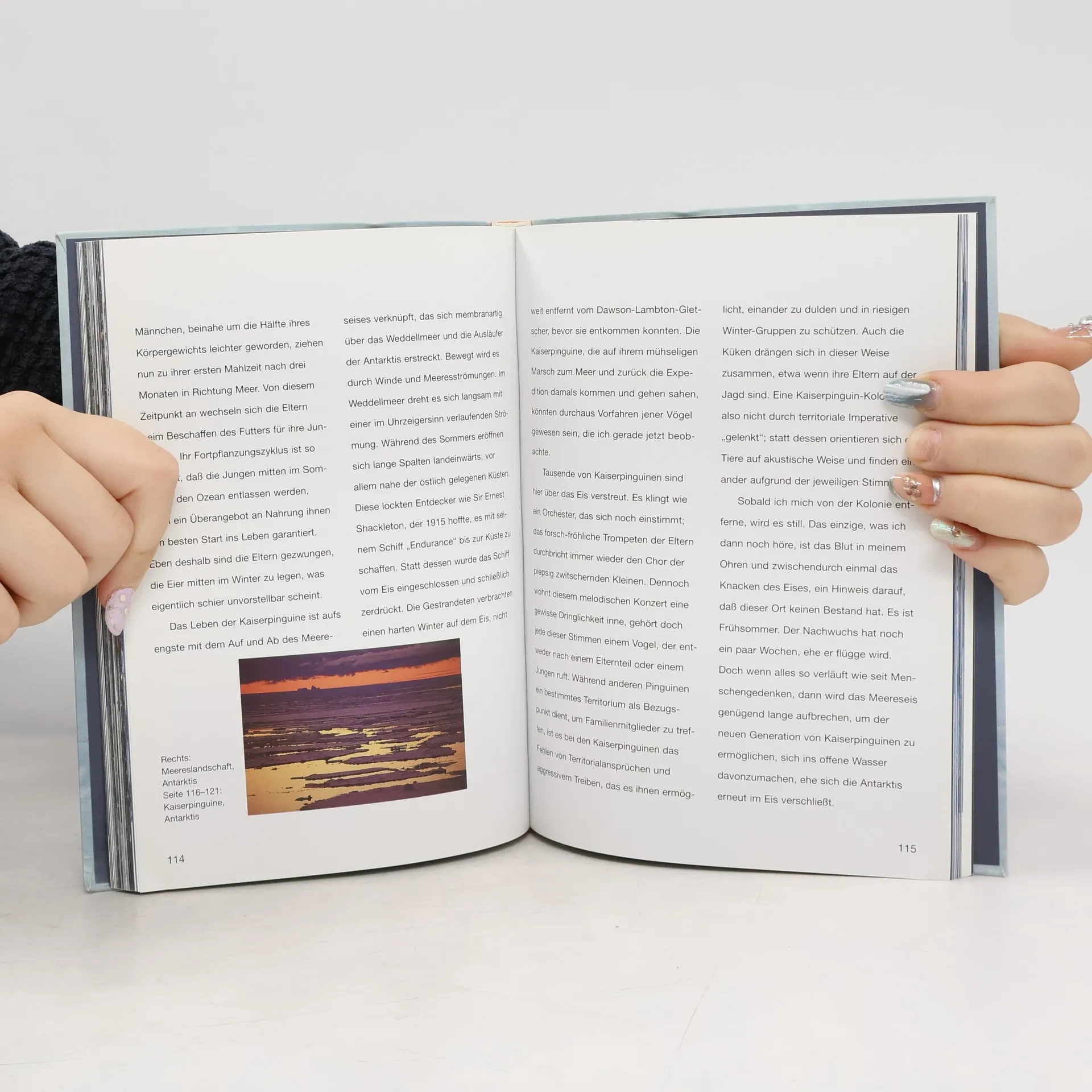 Lanting erzählt fotografisch von drei Reisen ins Reich der Pinguine: Falklandinseln (u.a. Felsen-, Esels- und Magellan-Pinguine), Süd-Georgien (Königspinguine) und Antarktis (Kaiserpinguine).