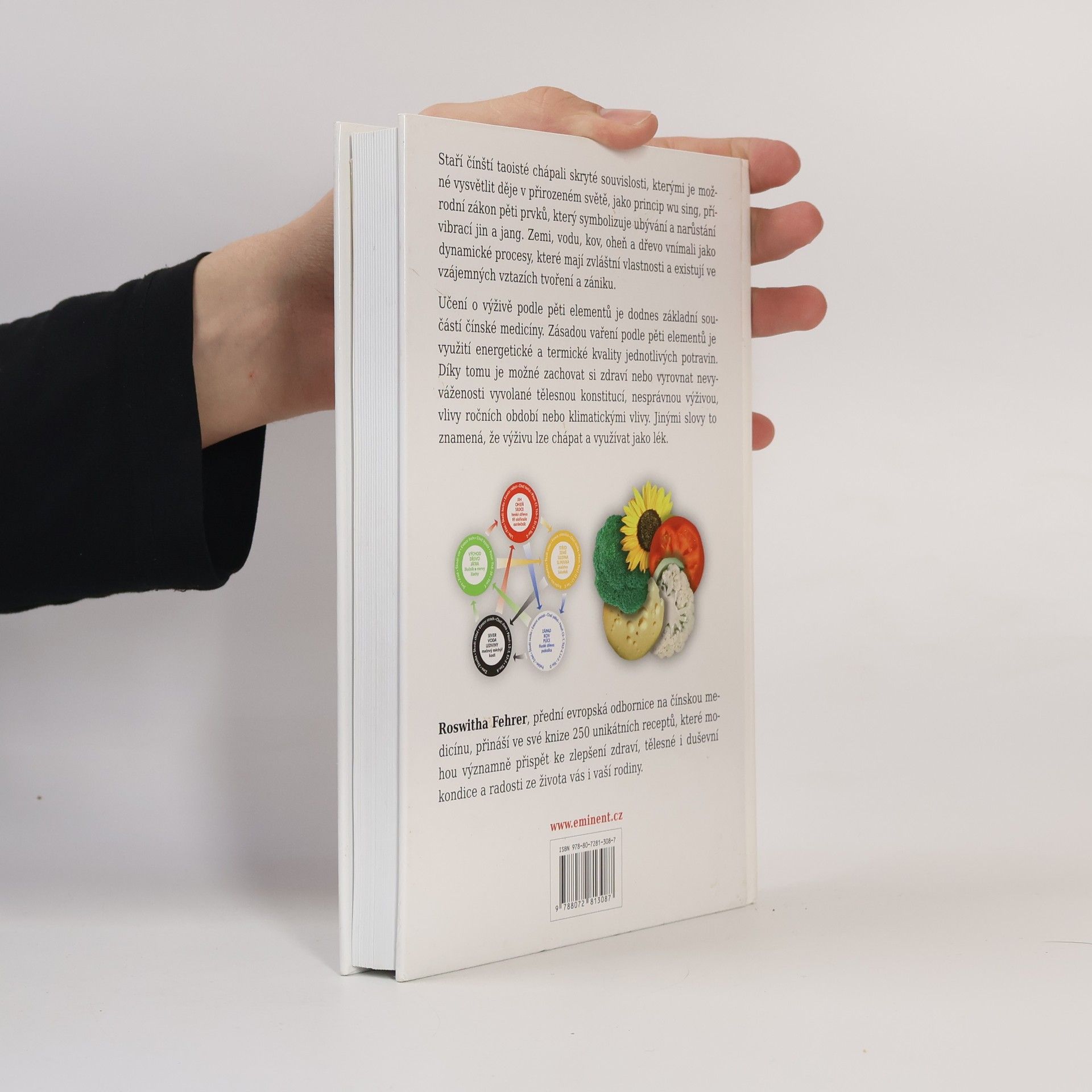 Staří čínští taoisté chápali skryté souvislosti, kterými je možné vysvětlit děje v přirozeném světě, jako princip wu sing, přírodní zákon pěti prvků, který symbolizuje ubývání a narůstání jin a jang. Zemi, vodu, kov, oheň a dřevo vnímali jako dynamické procesy, které mají zvláštní vlastnosti a existují ve vzájemných vztazích tvoření a zániku. Učení o výživě podle pěti elementů je dodnes základní součástí čínské medicíny. Zásadou vaření podle pěti elementů je využití energetické a termické kvality jednotlivých potravin. Díky tomu je možné si zachovat zdraví nebo vyrovnat nevyváženosti vyvolané tělesnou konstitucí, nesprávnou výživou, vlivy ročních období nebo klimatickými vlivy. Jinými slovy to znamená, že výživu je možné chápat a využívat jako lék. Roswitha Fehrer, přední evropská odbornice na čínskou medicínu, přináší ve své knize 250 unikátních receptů , které mohou významně přispět ke zlepšení zdraví, tělesné i duševní kondice a radosti ze života vás i vaší rodiny. Součástí knihy je velký barevný plakát, který přehledně znázorňuje dělení potravin podle pěti elementů.