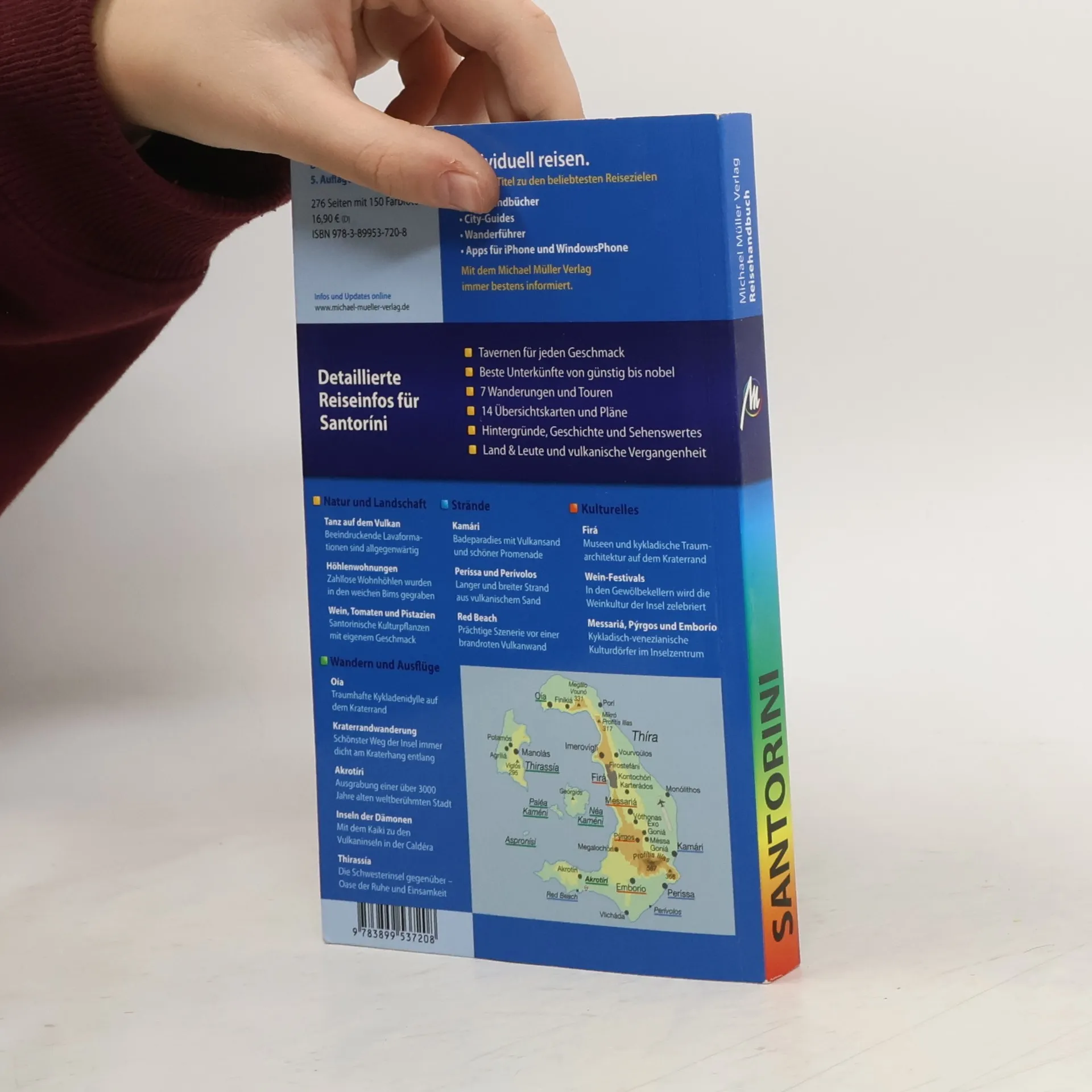 Schon der erste Anblick fasziniert: Unvermittelt steigen aus dem tiefblauen Meer 300 Meter hohe Kraterwände auf, hoch oben klammern sich schneeweiße Häuserwürfel an die brandroten Kämme. Santoríni, das südlichste Mitglied der Inselgruppe „Kykladen“ ist der bizarr geformte Restkörper eines gigantischen Vulkans, der um 1625 v. Chr. in einer der gewaltigsten Eruptionen der Weltgeschichte ausbrach. Die einzigartige Landschaft, aber auch die großartigen Ausgrabungsfunde - darunter viele herrliche Wandfresken, die Tausende von Jahren unter einer 60 Meter dicken Bimssteinschicht verschüttet lagen - haben Santoríni zu einem der beliebtesten Ziele des Mittelmeerraumes gemacht. Grund genug, die hochinteressante Insel einmal genau unter die Lupe zu nehmen. Das bewährte Autorenteam Dirk Schönrock und Eberhard Fohrer gibt in seinem neuen Handbuch detaillierte Informationen zu Geschichte, Sehenswürdigkeiten, Badestränden, Hotels und Tavernen und lädt den Leser darüber hinaus zu abwechslungsreichen Wanderungen ein.