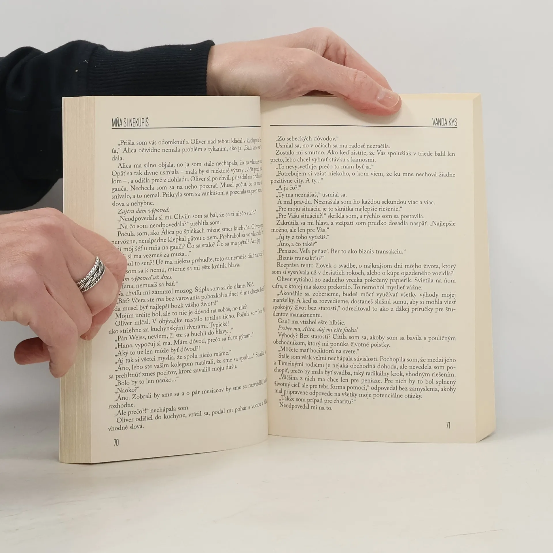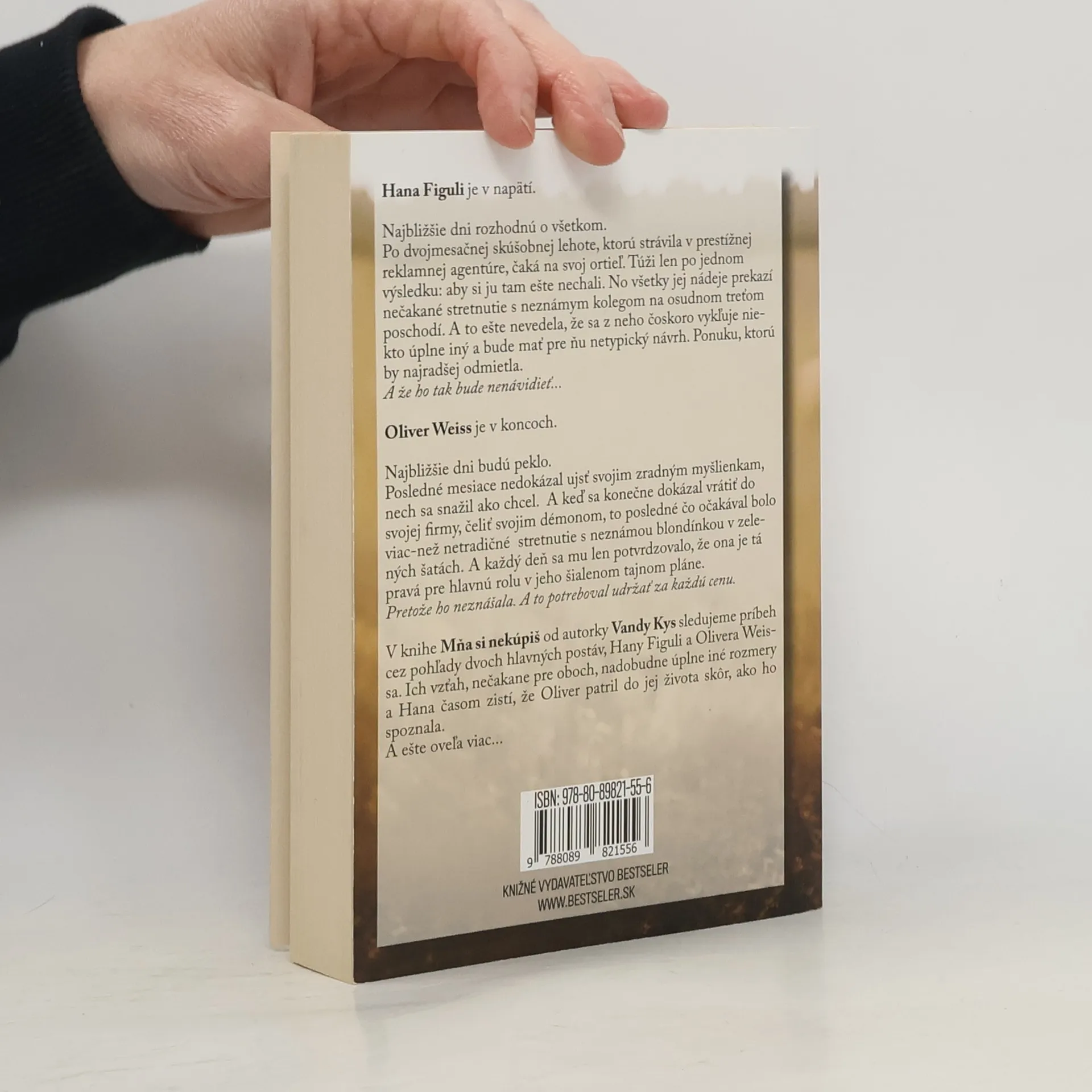 Hana Figuli je v napätí. Najbližšie dni rozhodnú o všetkom. Po dvojmesačnej skúšobnej lehote, ktorú strávila v prestížnej reklamnej agentúre, čaká na svoj ortieľ. Túži len po jednom výsledku: aby si ju tam ešte nechali. No všetky jej nádeje prekazí nečakané stretnutie s neznámym kolegom na osudnom treťom poschodí. A to ešte netuší, že sa z neho čoskoro vykľuje niekto úplne iný a bude mať pre ňu netypický návrh. Ponuku, ktorú by najradšej odmietla. A že ho tak bude nenávidieť… Oliver Weiss je v koncoch. Najbližšie dni budú peklo. Posledné mesiace nedokázal ujsť svojim zradným myšlienkam, nech sa snažil ako chcel. A keď sa konečne dokázal vrátiť do svojej firmy, čeliť svojim démonom, to posledné čo očakával bolo viac-než netradičné stretnutie s neznámou blondínkou v zelených šatách. A každý deň sa mu len potvrdzovalo, že ona je tá pravá pre hlavnú rolu v jeho šialenom tajnom pláne. Pretože ho neznášala. A to potreboval udržať za každú cenu. V knihe Mňa si nekúpiš od autorky Vandy Kys sledujeme príbeh cez pohľady dvoch hlavných postáv, Hany Figuli a Olivera Weissa. Ich vzťah, nečakane pre oboch, nadobudne úplne iné rozmery a Hana časom zistí, že Oliver patril do jej života skôr, ako ho spoznala. A ešte oveľa viac…