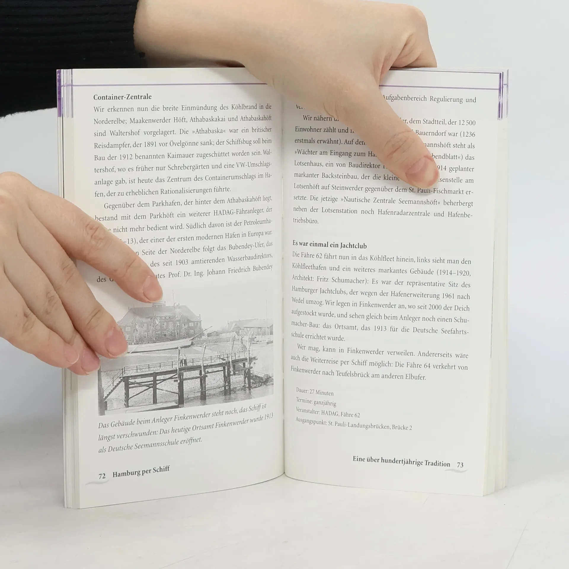 Hamburg, die Perle am Wasser, die Stadt im Grünen - die Metropole mit mehr Brücken als Venedig. Was liegt näher, als diese Stadt abseits gewöhnlicher Stadtrundfahrten per Schiff zu erkunden; gibt es doch in Hamburg selbst im öffentlichen Personennahverkehr eine Fährlinie. Weit über 40 Schiffstouren beschreibt dieses Buch. Unterwegs ist man mit Alterschiffen, Fähren, Barkssen auf der Elbe, der Alster, in Kanälen und Fleeten. Lassen Sie sich überraschen, wie viele Entdeckungen man in Hamburg per Schiff machen kann. Die Fahrt über Winterhudes Kanäle etwa kommt einer Lektion in Stadtteil- und Industriegeschichte gleich. Den Rathenaukanal finden Sie auf kaum einem Stadtplan, das 'Dampfboot-Wartezimmer' dürfte vielen ebenso unbekannt sein wie die aufwendig restaurierte Schokoladenfabrik von Hammerbrook, die Werften am Reiherstieg, die denkmalgeschützte erste Hammerbrooker Schleuse und die Insel 'Costa Billa'. Blicken Sie vom Schiff in gepflegte Gärten mit schönen Villen, erfahren Sie mehr über das bereits in den 1920er Jahren favorisierte 'Wohnen am Wasser', warum weshalb wo wann welcher Kanal gebaut wurde und was es mit den 'Teppichfahrten' auf sich hatte. Schiff ahoi!