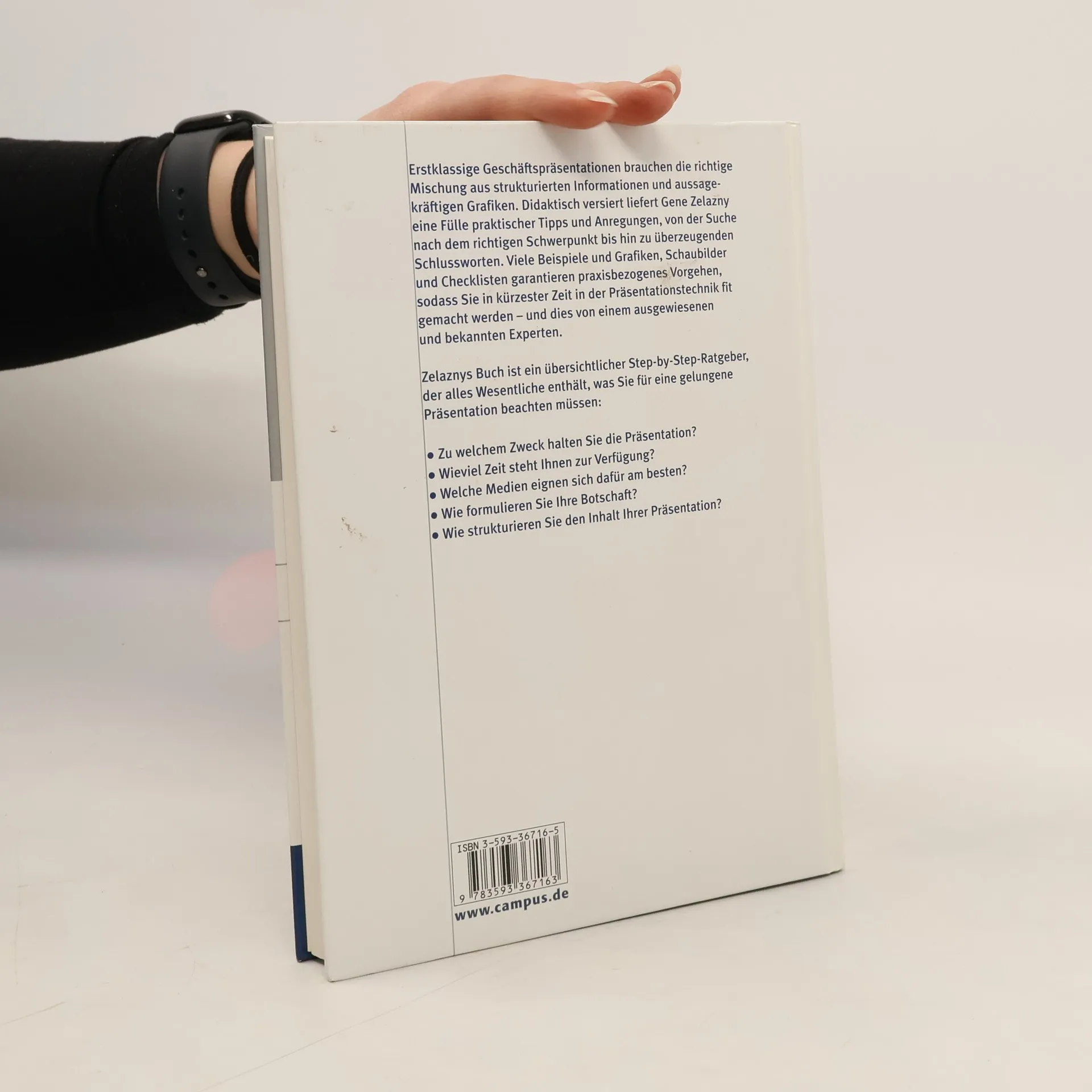 Erstklassige Geschäftspräsentationen brauchen die richtige Mischung aus strukturierten Informationen und aussagekräftigen Grafiken. Zelaznys Buch ist ein übersichtlicher Step-by-Step-Ratgeber, der alles Wesentliche enthält, was man für eine gelungene Präsentation beachten muss. Zu welchem Zweck wird die Präsentation gehalten, wieviel Zeit steht zur Verfügung, welche Medien sollen eingesetzt werden? Didaktisch versiert liefert Gene Zelazny praktische Tipps und Anregungen, von der Suche nach dem richtigen Schwerpunkt bis hin zu überzeugenden Schlussworten. Viele Beispiele und Grafiken, Schaubilder und Checklisten garantieren praxisbezogenes Vorgehen, sodass der Leser in kürzester Zeit in der Präsentationstechnik fit gemacht wird.