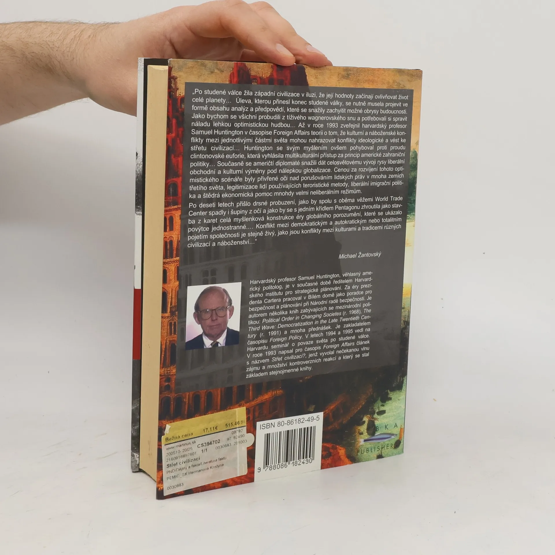 Boj kultur a proměna světového řádu. Kniha předního amerického politologa je pronikavou analýzou stavu světové politiky po skončení studené války, kdy hnacími silami již nejsou národní státy a ideologie, nýbrž civilizace vymezené náboženskými, právními a kulturními tradicemi. Globální politika bude formována především kulturními rozdíly a pokud propuknou války, budou se týkat celých civilizací. Právě na rozhraní těchto kultur ve "zlomových liniích" se nacházejí možná ohniska konfliktů, jež mohou přerůst v mezicivilizační střety. Huntington varuje před rozšířením a vystupňováním těchto střetů a zevrubně analyzuje důvody, které k nim vedou: změny mocenské rovnováhy mezi Západem a někdejšími koloniálními oblastmi třetího světa, ekonomický, vojenský i politický růst asijských civilizací, kulturní obrat nezápadních společností k domácím tradicím, demografická exploze a konflikty vyvolané militantností islámu a vzestupem Číny....