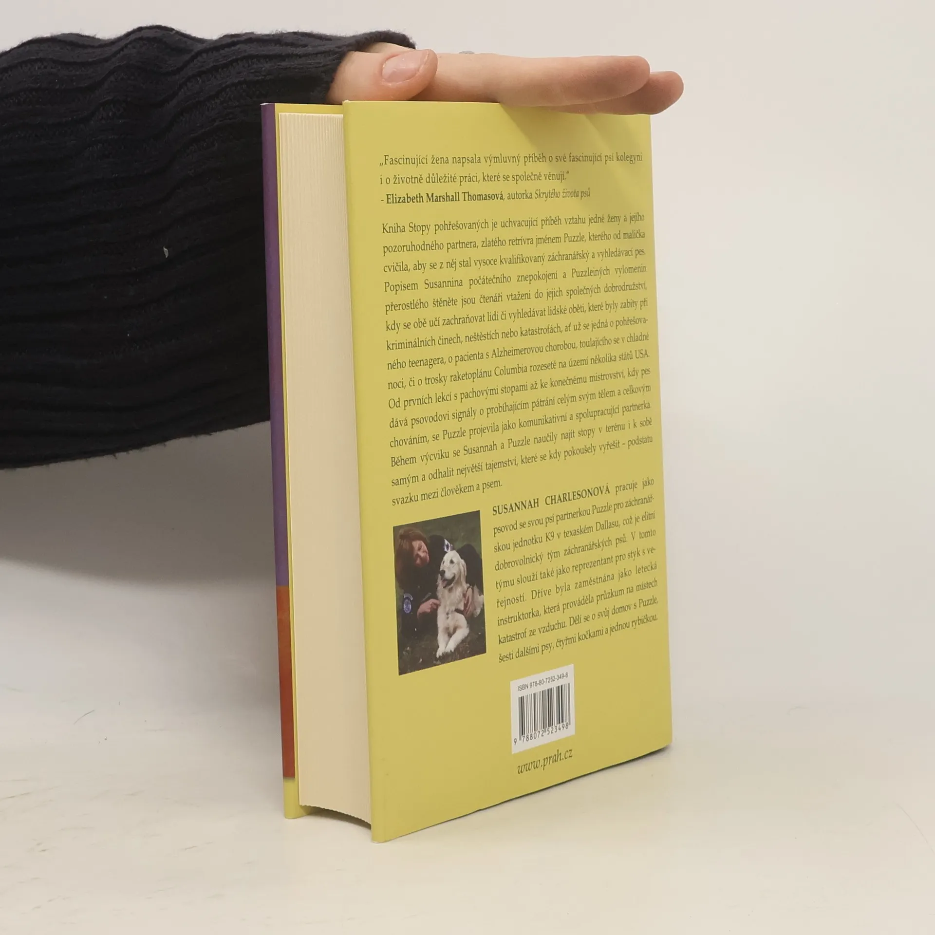 Kniha Stopy pohřešovaných je uchvacující příběh vztahu jedné ženy a jejího pozoruhodného partnera, zlatého retrívra jménem Puzzle, kterého od malička cvičila, aby se z něj stal vysoce kvalifikovaný záchranářský a vyhledávací pes. Popisem Susannina počátečního znepokojení a Puzzleiných vylomenin přerostlého štěněte jsou čtenáři vtaženi do jejich společných dobrodružství, kdy se obě učí zachraňovat lidi či vyhledávat lidské oběti, které byly zabity při kriminálních činech, neštěstích nebo katastrofách, ať už se jedná o pohřešovaného teenagera, o pacienta s Alzheimerovou chorobou, toulajícího se v chladné noci, či o trosky raketoplánu Columbia rozeseté na území několika států USA. Od prvních lekcí s pachovými stopami až ke konečnému mistrovství, kdy pes dává psovodovi signály o probíhajícím pátrání celým svým tělem a celkovým chováním, se Puzzle projevila jako komunikativní a spolupracující partnerka. Během výcviku se Susannah a Puzzle naučily najít stopy v terénu i k sobě samým a odhalit největší tajemství, které se kdy pokoušely vyřešit - podstatu svazku mezi člověkem a psem. New York Times bestseller