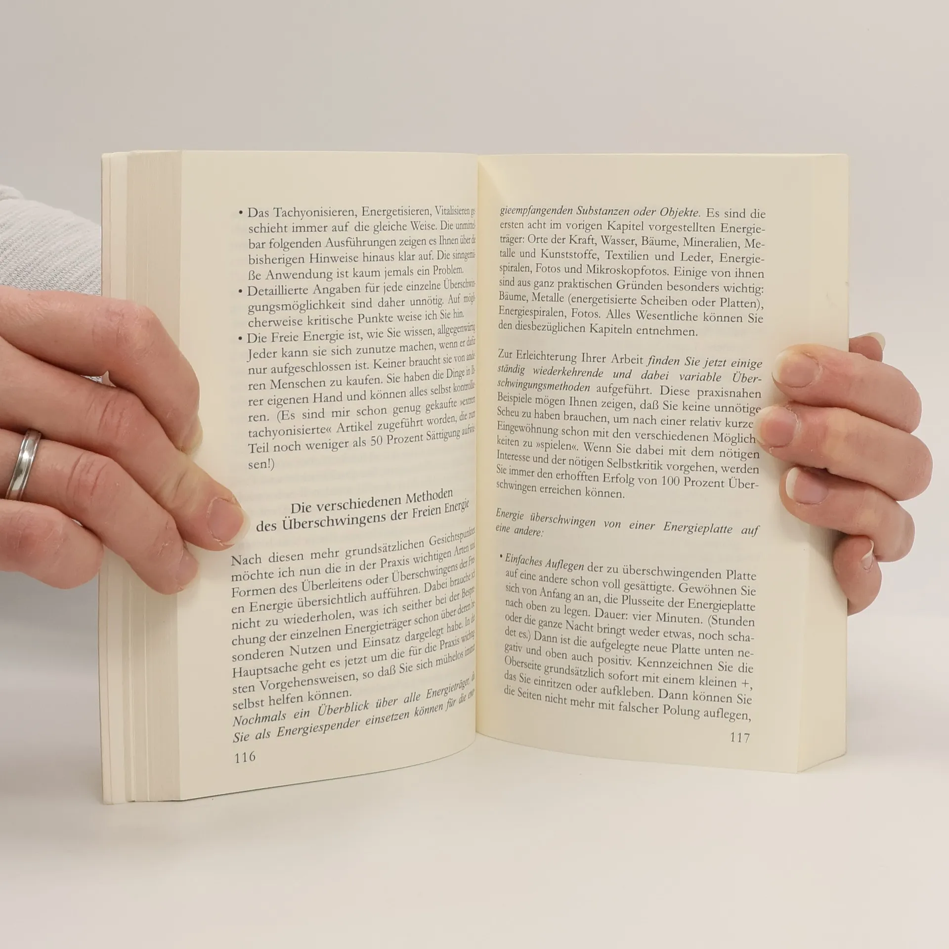 Beschreibung der universellen, 'Freien Energie' Beschreibung der Energieträger Das Einfangen der Freien Energie und ihre Überschwingung auf andere Energieträger Wesentliche Arbeitsgrundsätze Der praktische Einsatz der verschiedenen Energieträger Neutralisierung der Belastung von Lebensmitteln Neutralisierung der Geopathischen Belastung Schutz vor negativen Fremdenergien Anweisung zur Selbstherstellung einer Energiespirale