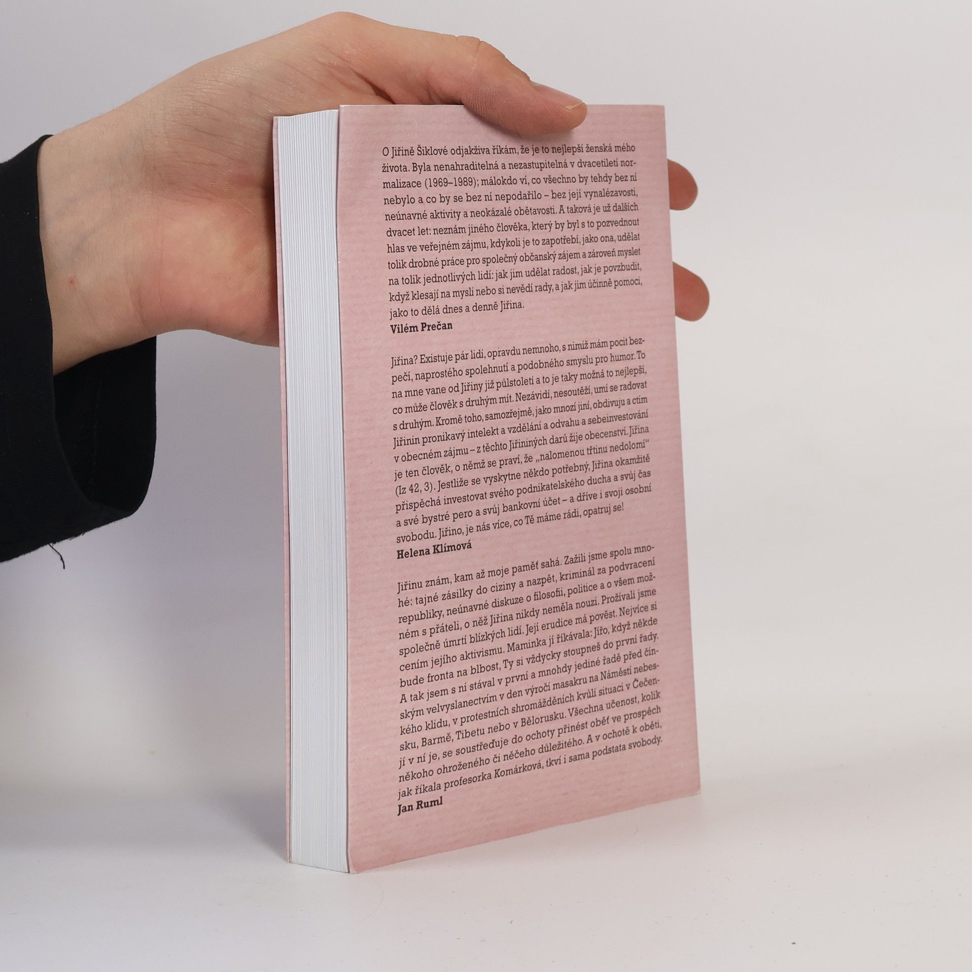 Knižní rozhovor s Jiřinou Šiklovou (1935) supluje memoáry, které uznávaná socioložka a pedagožka zřejmě nikdy nenapíše. Víc než minulost ji totiž zajímají přítomné okamžiky naší společnosti, které břitce a s nadhledem neustále komentuje. Její vzpomínky jsou přitom košaté, detailní a glosátorské. Šiklová v knize podrobně líčí ilegální kurýrní kanál, přes který se do Československa v době normalizace dostávaly exilové časopisy a v zahraničí vydané knihy doma zakázaných autorů. Šiklová si jako významná spojka mezi disidenty a exilem počínala velmi neohroženě. Rozvinula k dokonalosti své konspirativní schopnosti, takže zůstala až do zatčení v roce 1981 neodhalena. Rozhovor s Jiřinou Šiklovou je životopisným líčením sebeironické intelektuálky, která každé své rozhodnutí zpětně analyzuje: svůj vstup do KSČ, roli při Pražském jaru, politickou perzekuci, kurýrní práci, roční vězení i porevoluční aktivity včetně založení Genders Studies. Stranou nezůstalo ani její soukromí, které je, jak se ukazuje, často skrytou motivací významných rozhodnutí