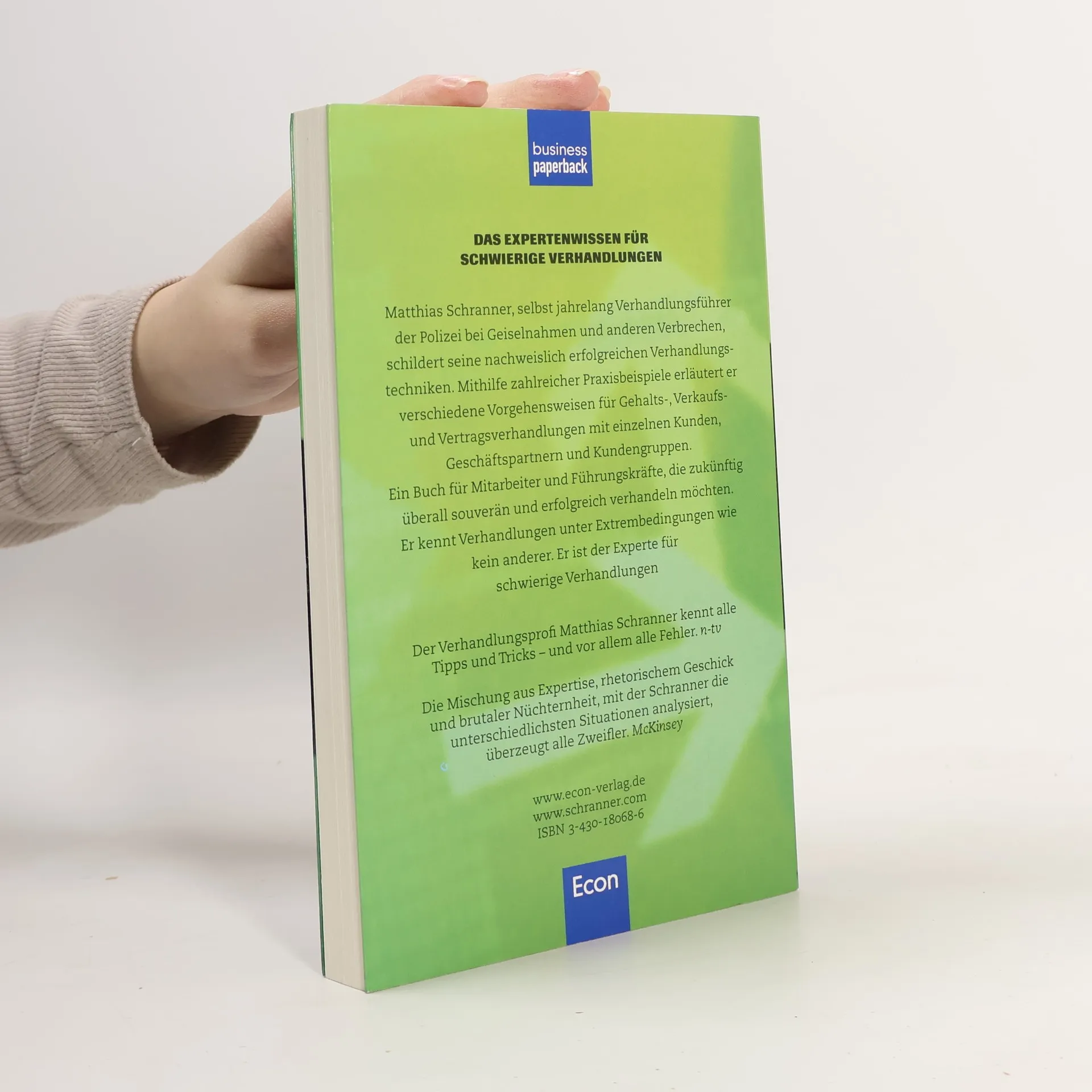 Anhand zahlreicher Praxisbeispiele aus dem privaten und beruflichen Bereich werden verschiedene Techniken erläutert, wie man erfolgreich in Gehalts-, Verkaufs- und Vertragsverhandlungen vorgeht. Denn fast jeden Tag führen wir Verhandlungen, welche oft einen unbefriedigenden Verlauf nehmen: weil wir gestreßt sind, weil wir mit aggressivem oder unfairem Verhalten konfrontiert sind oder weil uns die Situation schlicht überfordert. Dieses Buch zeigt jedoch, wie durch gründliche Vorbereitung, eine ausgesuchte Strategie und zielgerichtete Taktik beide Seiten zu einem zufriedenstellenden Ergebnis gelangen. Wenn Sie Herrn Schranner als Redner buchen möchten, kontaktieren Sie bitte die Econ Referenten-Agentur.
