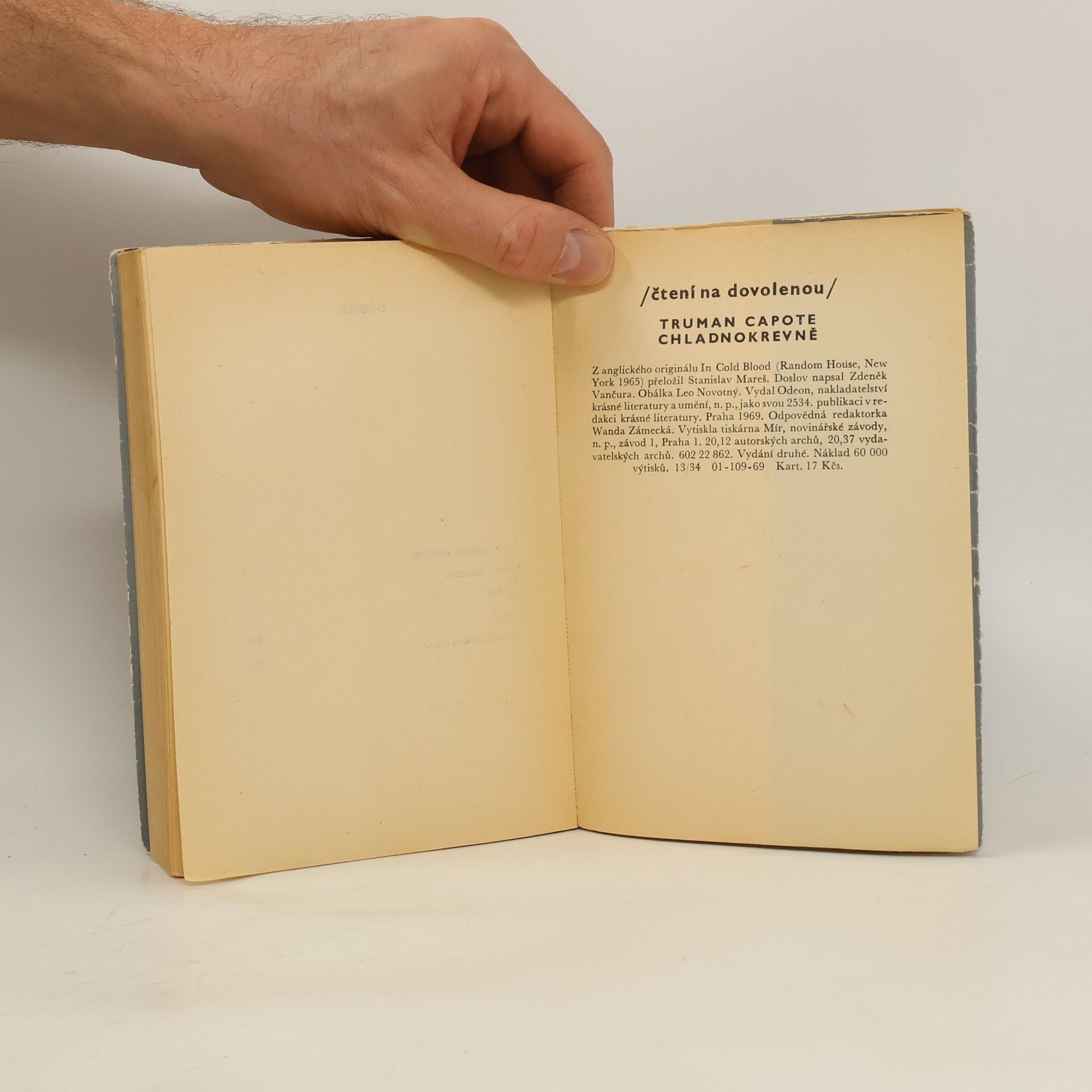 Chladnokrevně : pravdivé vylíčení čtyřnásobné vraždy a jejích důsledků Umělecká, románově pojatá reportáž o čtyřnásobné vraždě v Americe r. 1959 a o dopadení, vyšetřování a potrestání vrahů; román z pera významného amerického spisovatele. Autor v něm výběrem a dramatickým řazením faktů rekonstruje bestiální vraždu čtyř členů farmářské rodiny v zapadlé vesnici v Kansasu dvěma patologicky zrůdnými chuligány, a to od motivu vraždy, přes vraždu samu, až po potrestánízločinců trestem smrti. Autor doslovu o knize říká, že je možno ji číst "jako krutě věcné hlášení o činu přímo bestiálním... i jako detektivní příběh složitého pátrání, nacházení stop, zatčení, výslechů a konečné zdrcující, překvapivé rekonstrukce nejen toho, co se stalo, ale i důvodů proč se to stalo". Doslov napsal Zdeněk Vančura.