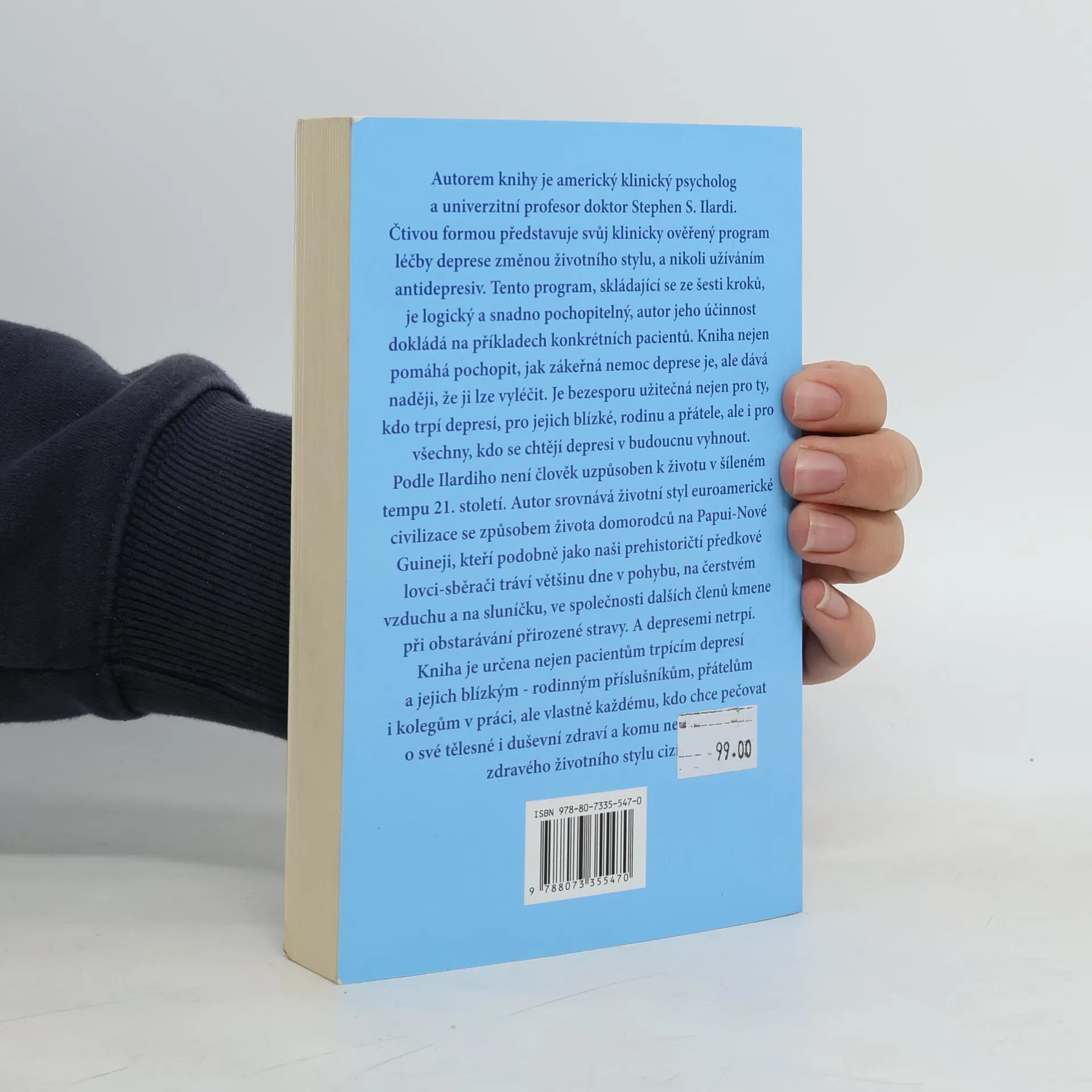 Přehledná a srozumitelná kniha amerického klinického psychologa a univerzitního profesora doktora Stephena S. Ilardiho představuje klinicky ověřený program léčby deprese založený na změně životního stylu, a nikoli na užívání antidepresiv. Účinnost programu, který sestává ze šesti kroků, dokládá autor na příkladech konkrétních pacientů. Publikace nejen pomáhá pochopit, jak zákeřnou nemocí deprese je, ale dává naději, že ji lze léčit a vyléčit. Kniha může pomoci jak těm, kdo trpí depresí, tak jejich blízkým – rodině a přátelům, a v neposlední řadě všem, kdo se chtějí depresi ve svém životě vyhnout, chtějí pečovat o své duševní i tělesné zdraví a myšlenka zdravého životního stylu jim není cizí. Ilardi tvrdí, že člověk není uzpůsoben pro zběsilé tempo 21. století. Životní styl euroamerické civilizace srovnává se způsobem života domorodců na Papui Nové Guinei, kteří podobně jako naši prehistoričtí předkové lovci-sběrači tráví většinu dne v pohybu na vzduchu a na slunci, kde si ve společnosti dalších členů kmene obstarávají přirozenou stravu. A depresi neznají.