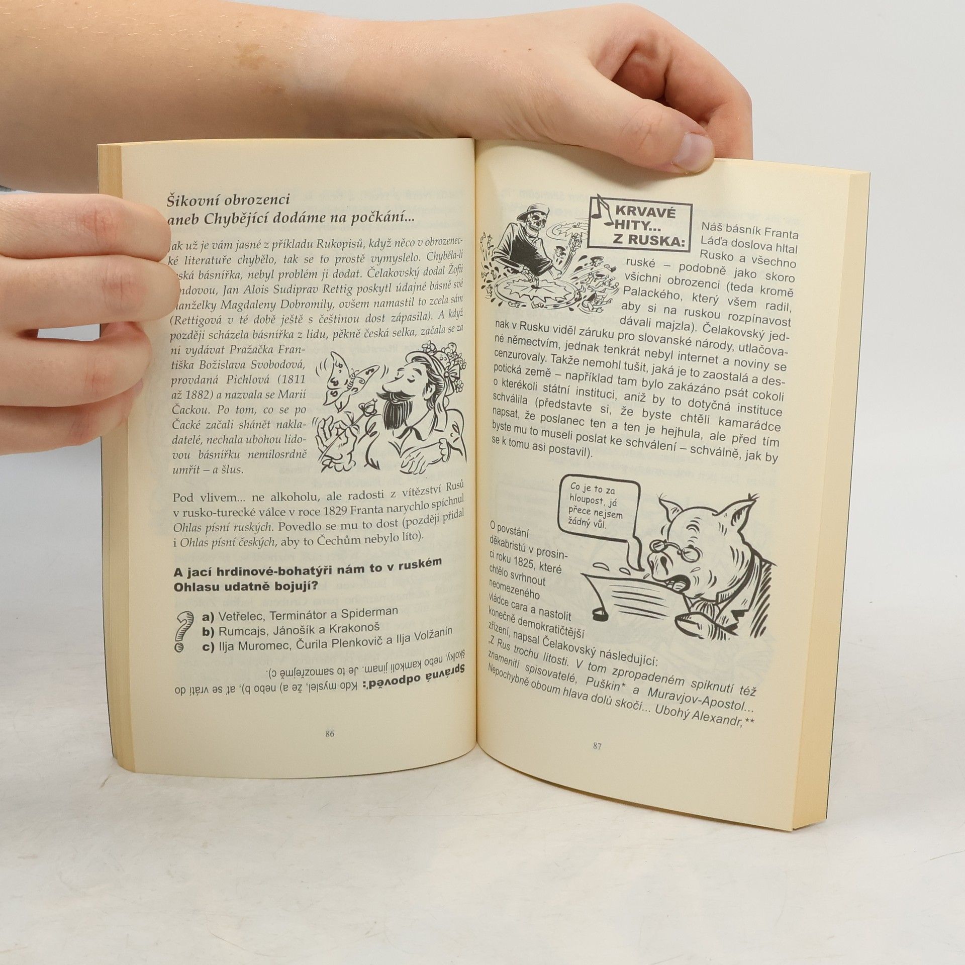 Obrozenci nebyli žádní prkenní panáci, jak se vám snaží namluvit ve škole, ale lidi z masa a kostí, kteří to uměli pořádně rozbalit. Tato kniha vám odhalí spoustu zamlčovaných faktů! Dozvíte se například, že Dobrovský balancoval na hranici šílenství, Jungmann jako teenager zjistil, že vlastně neumí česky, Purkyně experimentoval s drogami a ještě spoustu dalších věcí, o kterých se vám učitelé neodvažují říct. České dějiny nikdy nebyly tak děsné!