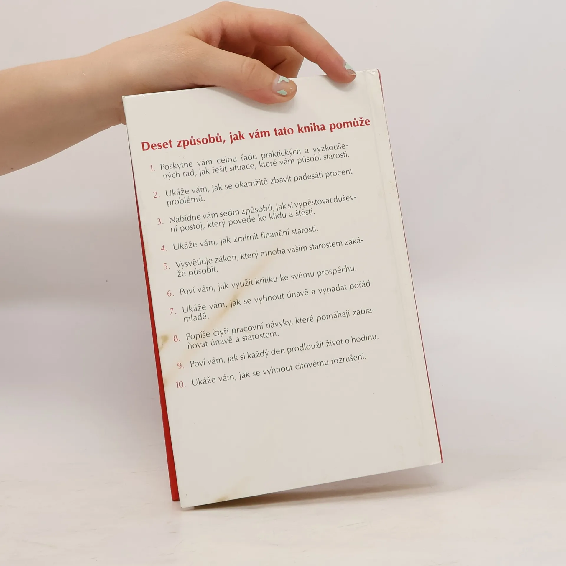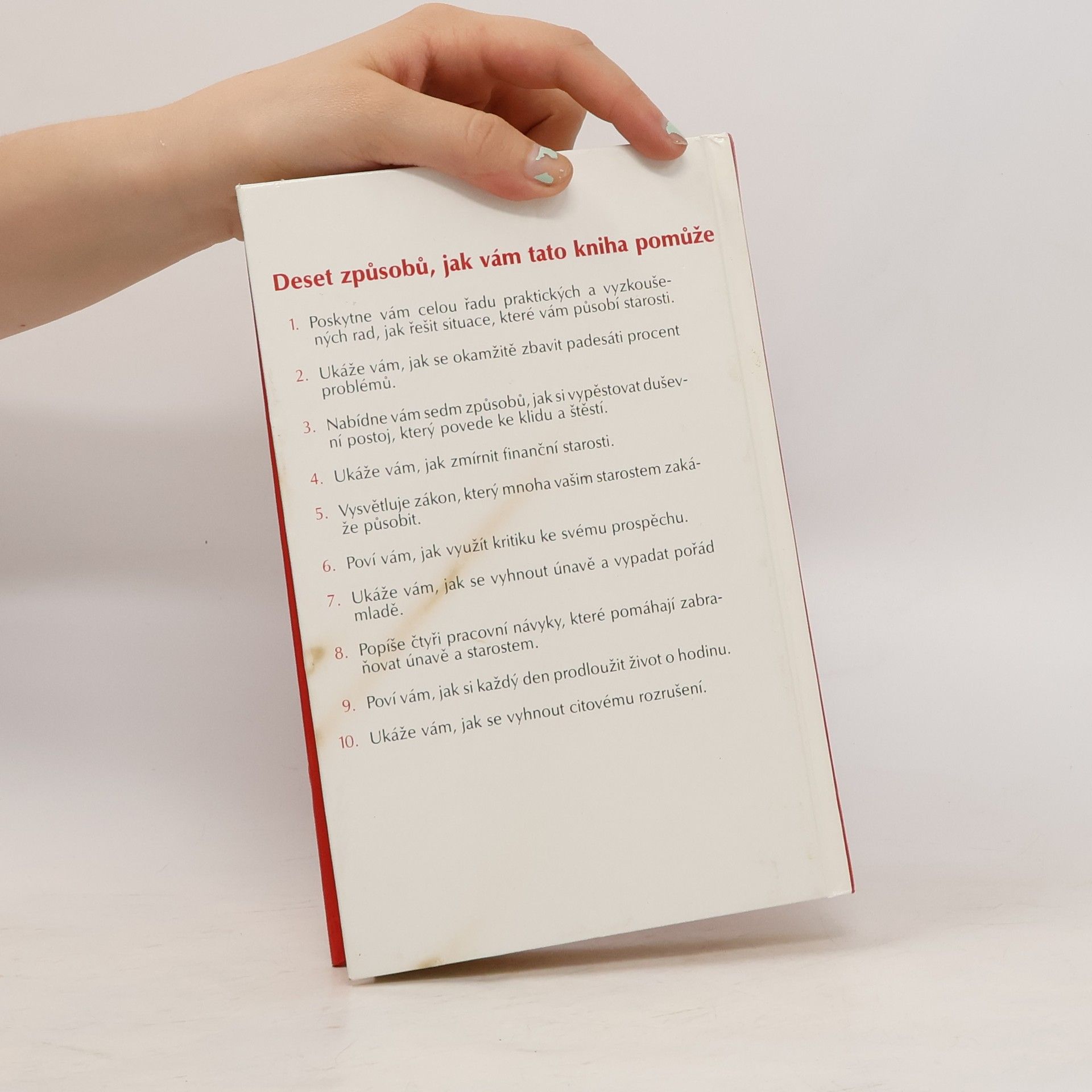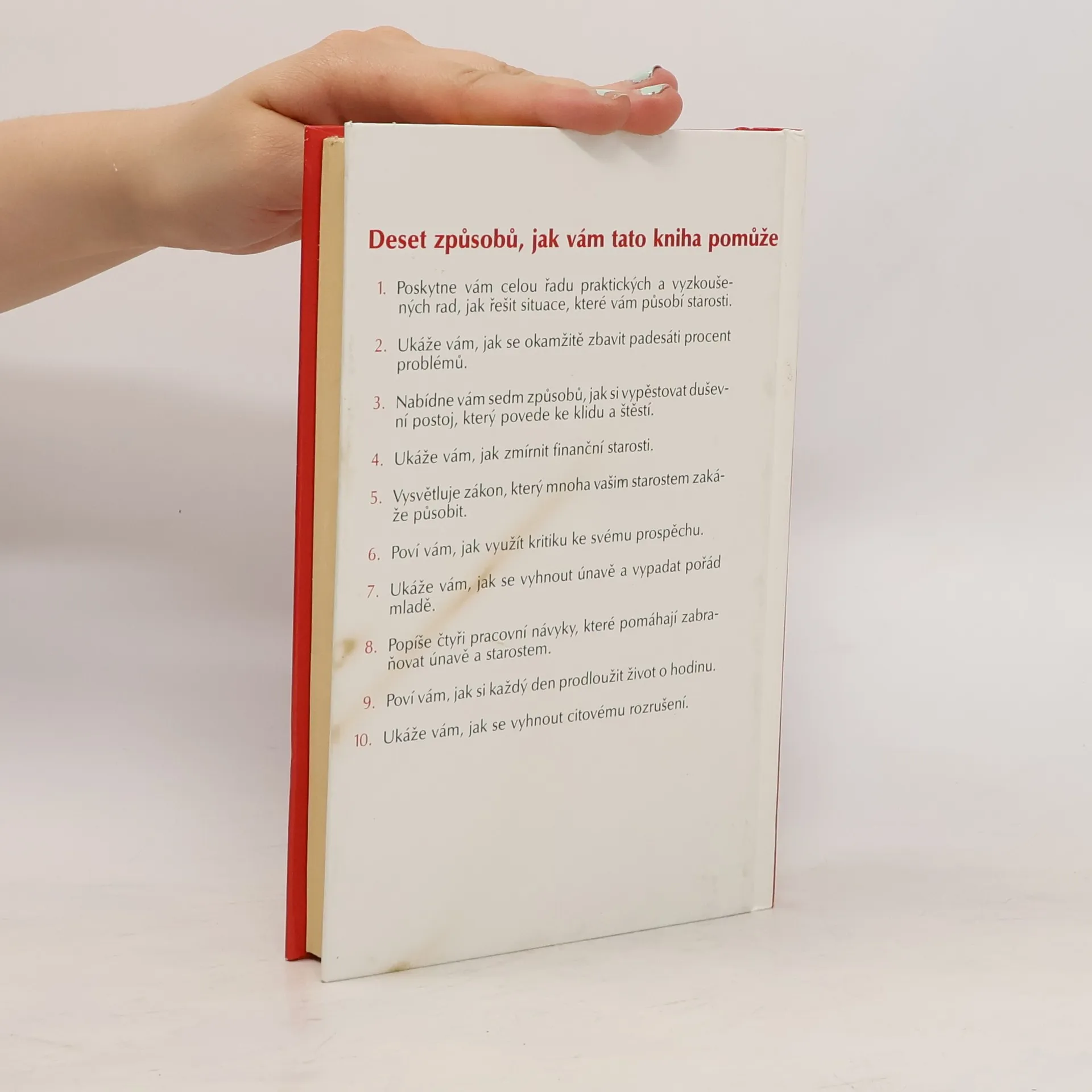 Deset způsobů, jak vám tato kniha pomůže: 1. Poskytne vám celou řadu praktických a vyzkoušených rad, jak řešit situace, které vám působí starosti. 2. Ukáže vám, jak se okamžitě zbavit padesáti procent problémů. 3. Nabídne vám sedm způsobů, jak si vypěstovat duševní postoj, který povede ke klidu a štěstí. 4. Ukáže Vám, jak zmírnit finanční starosti. 5. Vysvětluje zákon, který mnoha vašim starostem zakáže působit. 6. Poví vám, jak využít kritiku ke svému prospěchu. 7. Ukáže vám, jak se vyhnout únavě a vypadat pořád mladě. 8. Popíše čtyři pracovní návyky, které pomáhají zabraňovat únavě a starostem. 9. Poví vám, jak si každý den prodloužit život o hodinu. 10. Ukáže vám, jak se vyhnout citovému rozrušení. (méně textu)